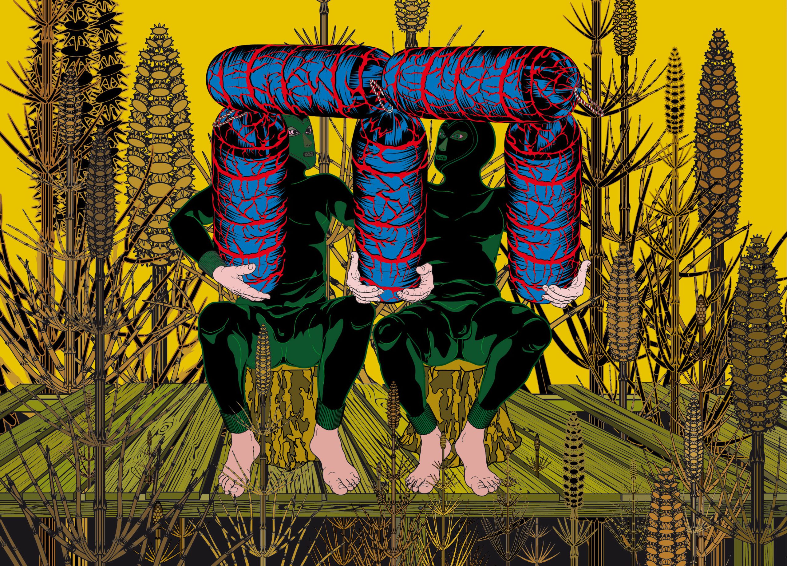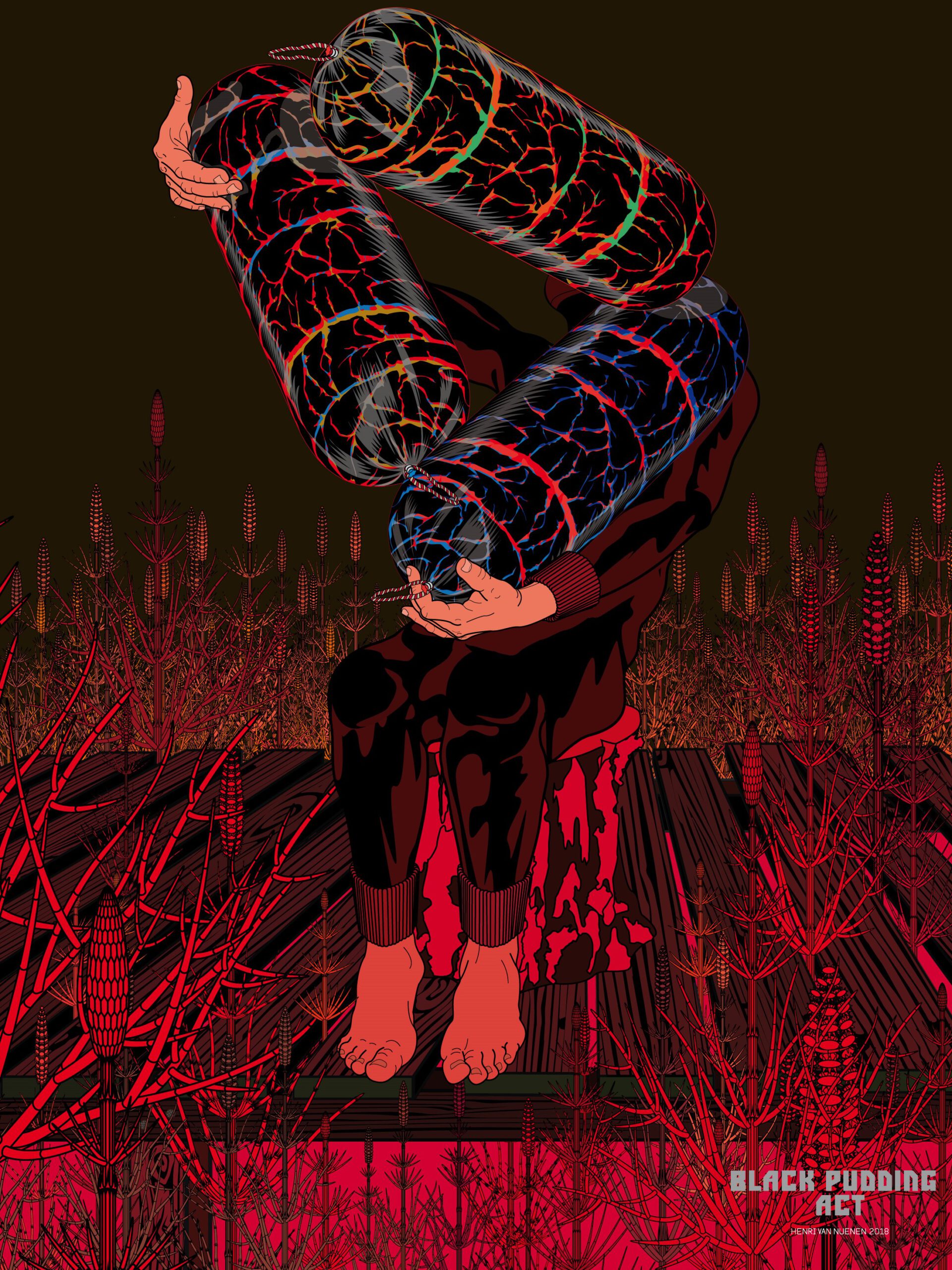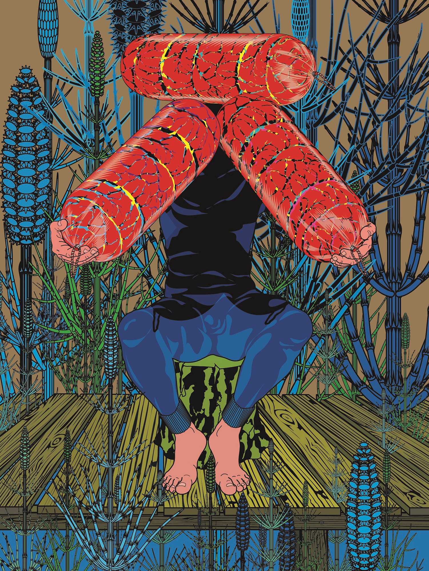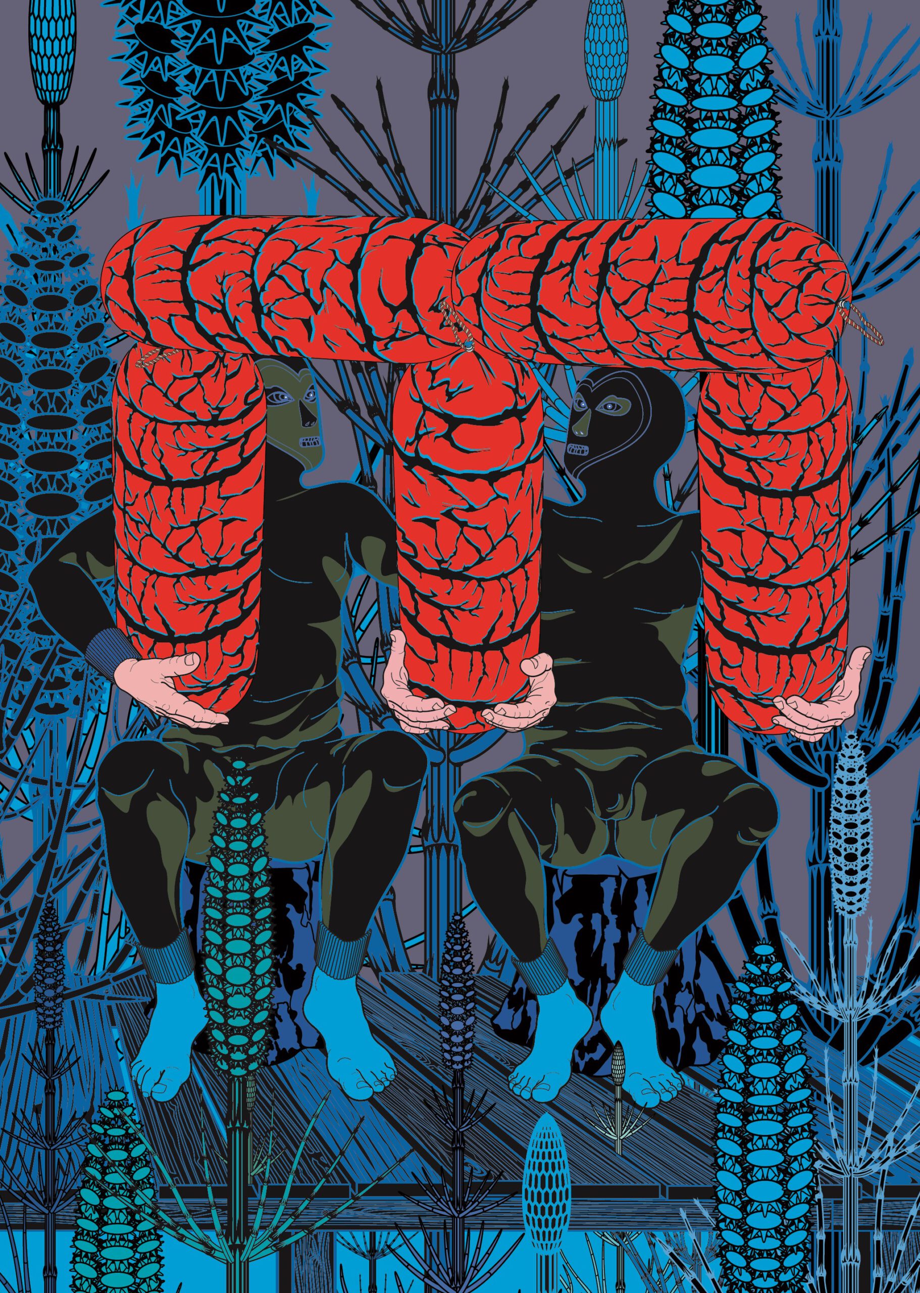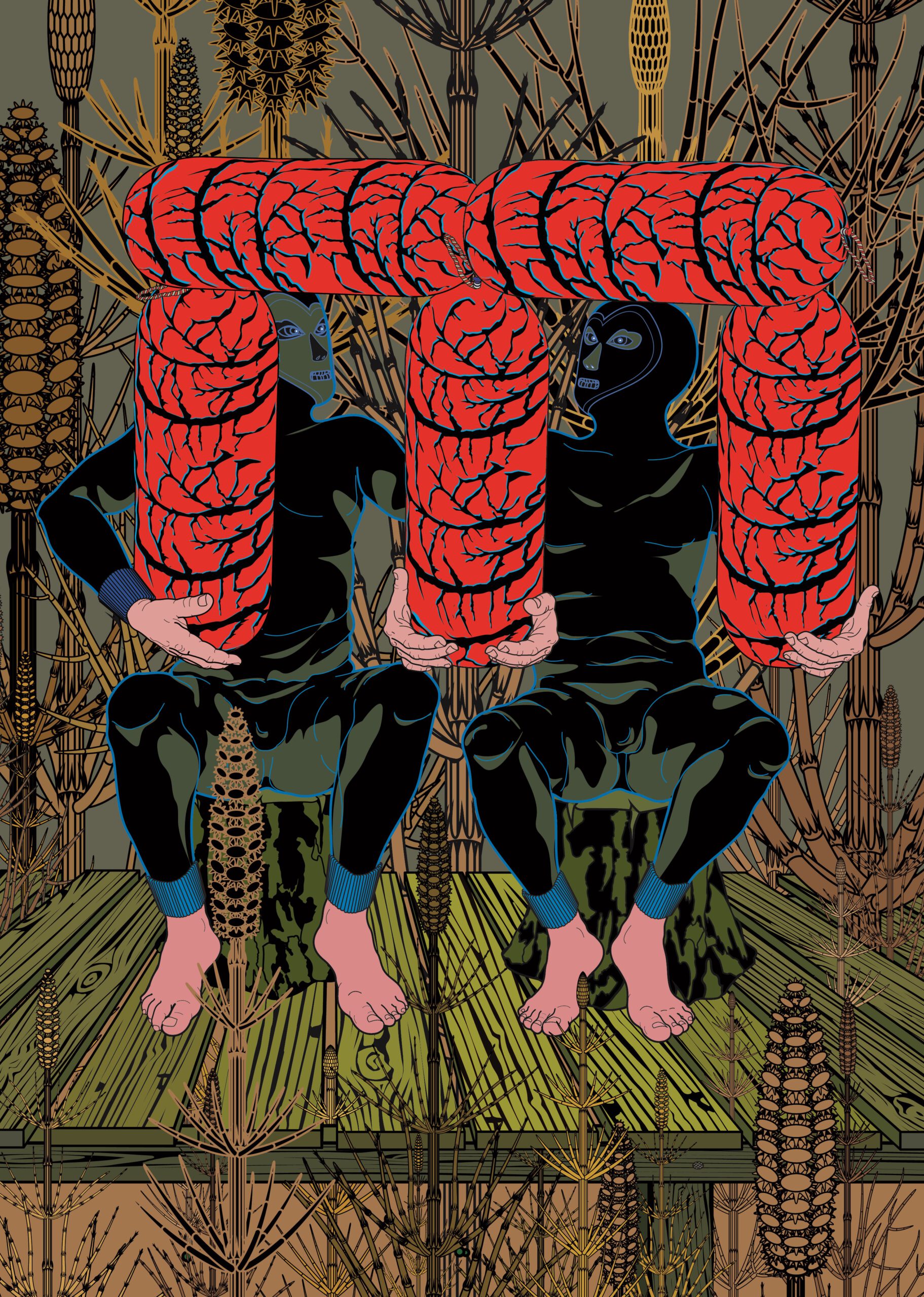 Vier zittende manfiguren vertonen bloedserieus een kunstje met drie bloedworsten,op een loopplank in het heidelandschap.