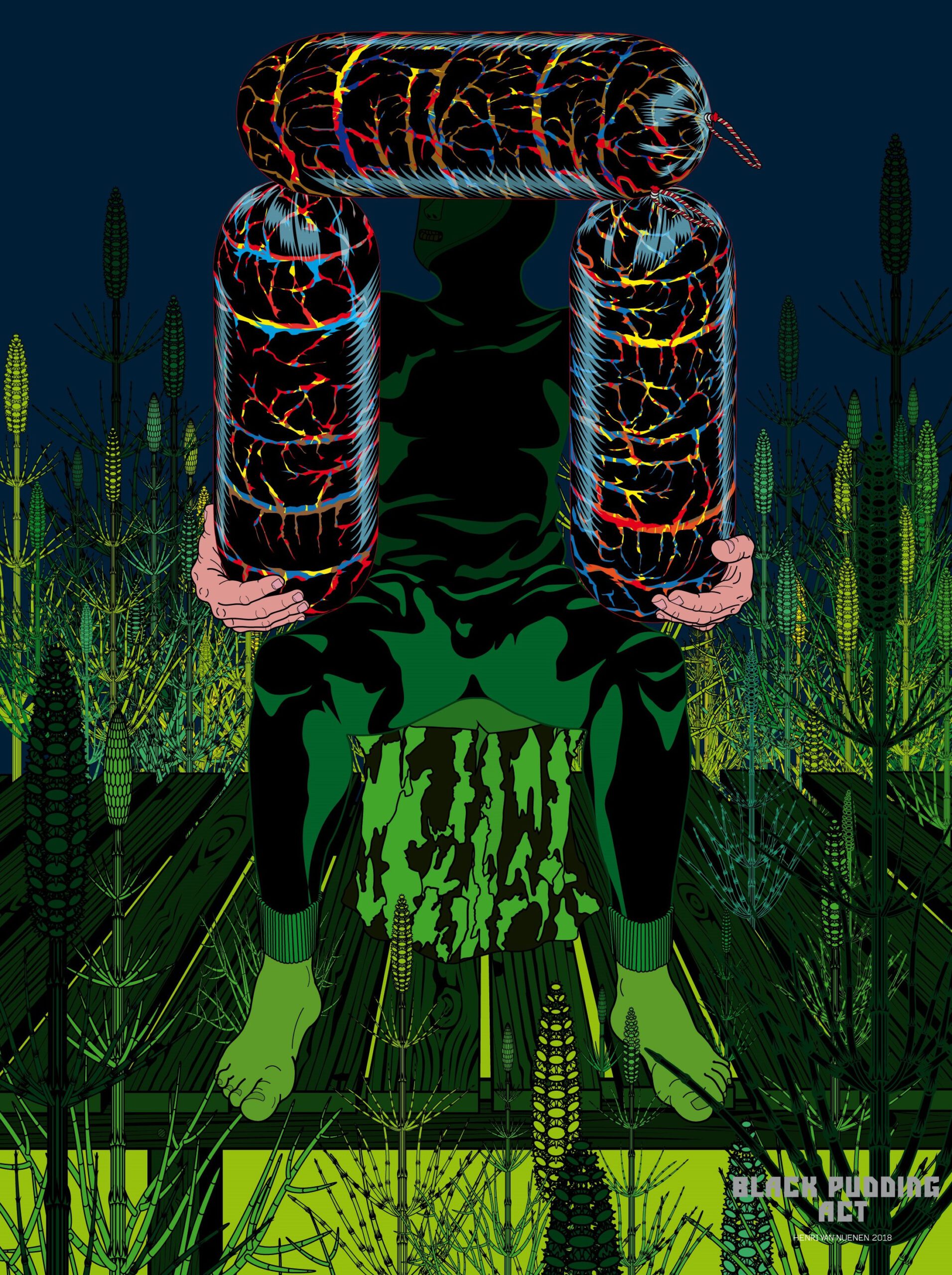 Manfiguren in excentrieke pakken spelen bloedworst acts met bloedworsten die in park ZOMERHEIDE op ambachtelijke wijze wordt gemaakt.