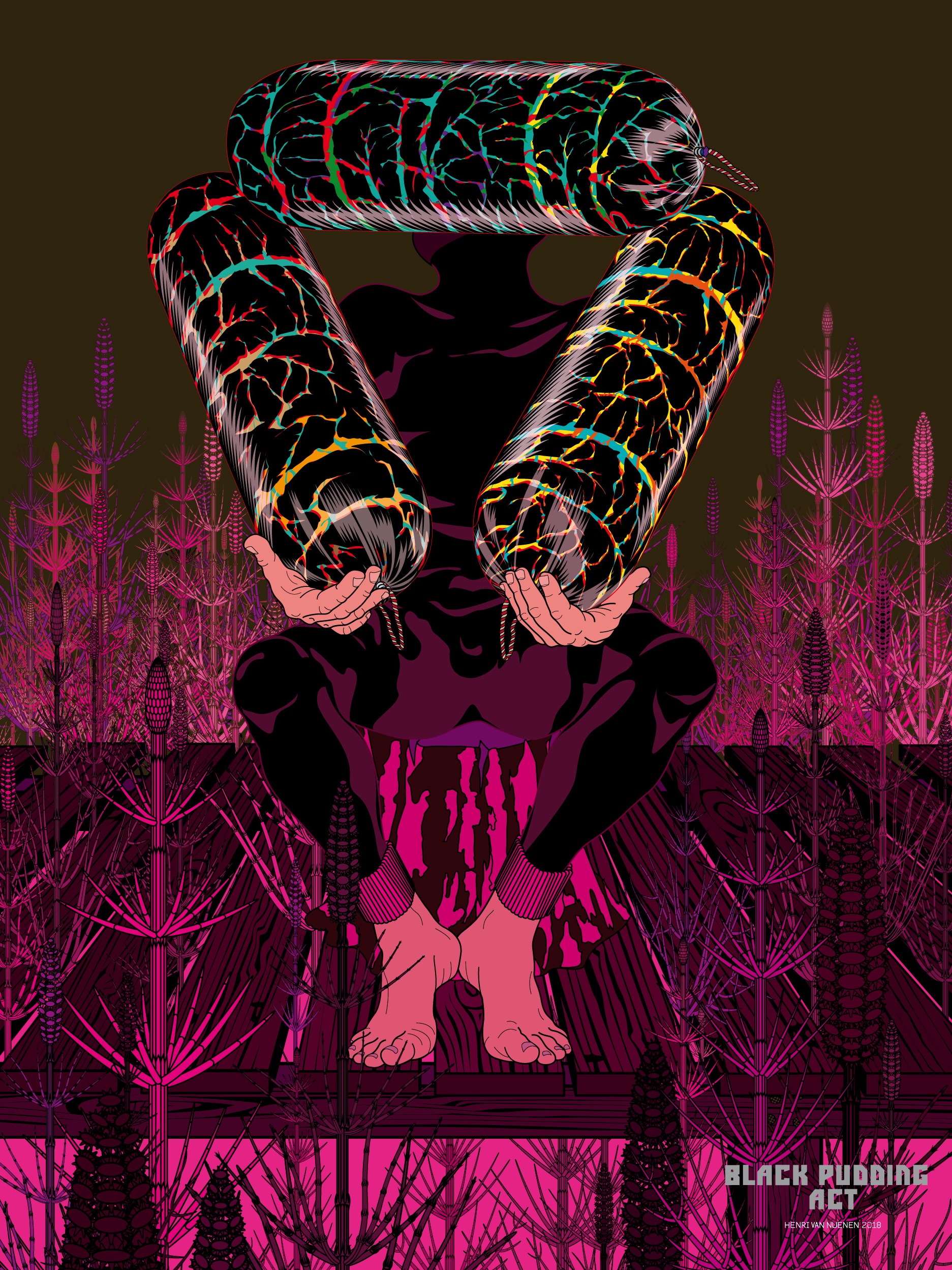 Het kunstlicht maakt de prachtig gemarmerde zwarte bloedworsten fluoriserend, een beeldend schouwspel.