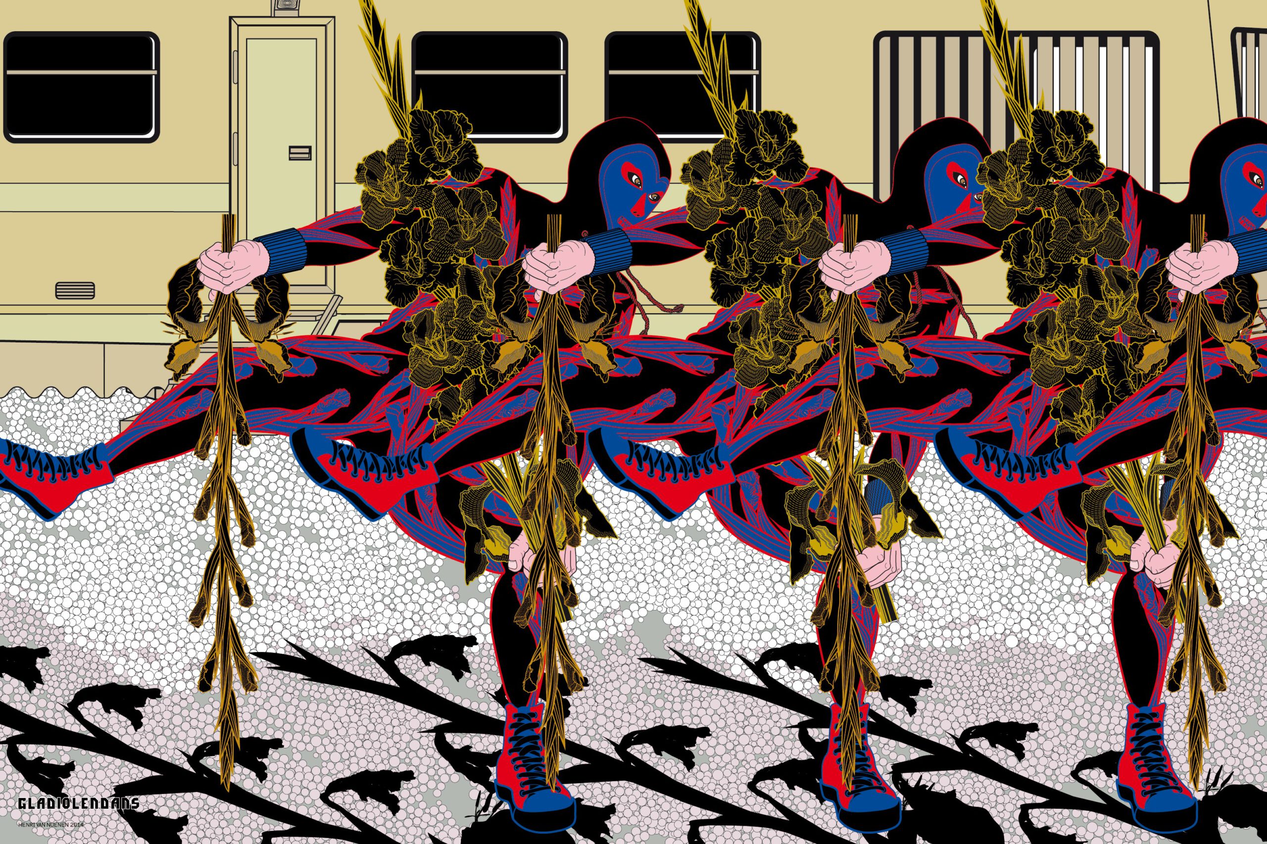 De gladiolendans is een mannendans. De manfiguren dragen excentrieke gladiolenpakken, ze houden een zwaardbloem vast en maken repeterende figuren.