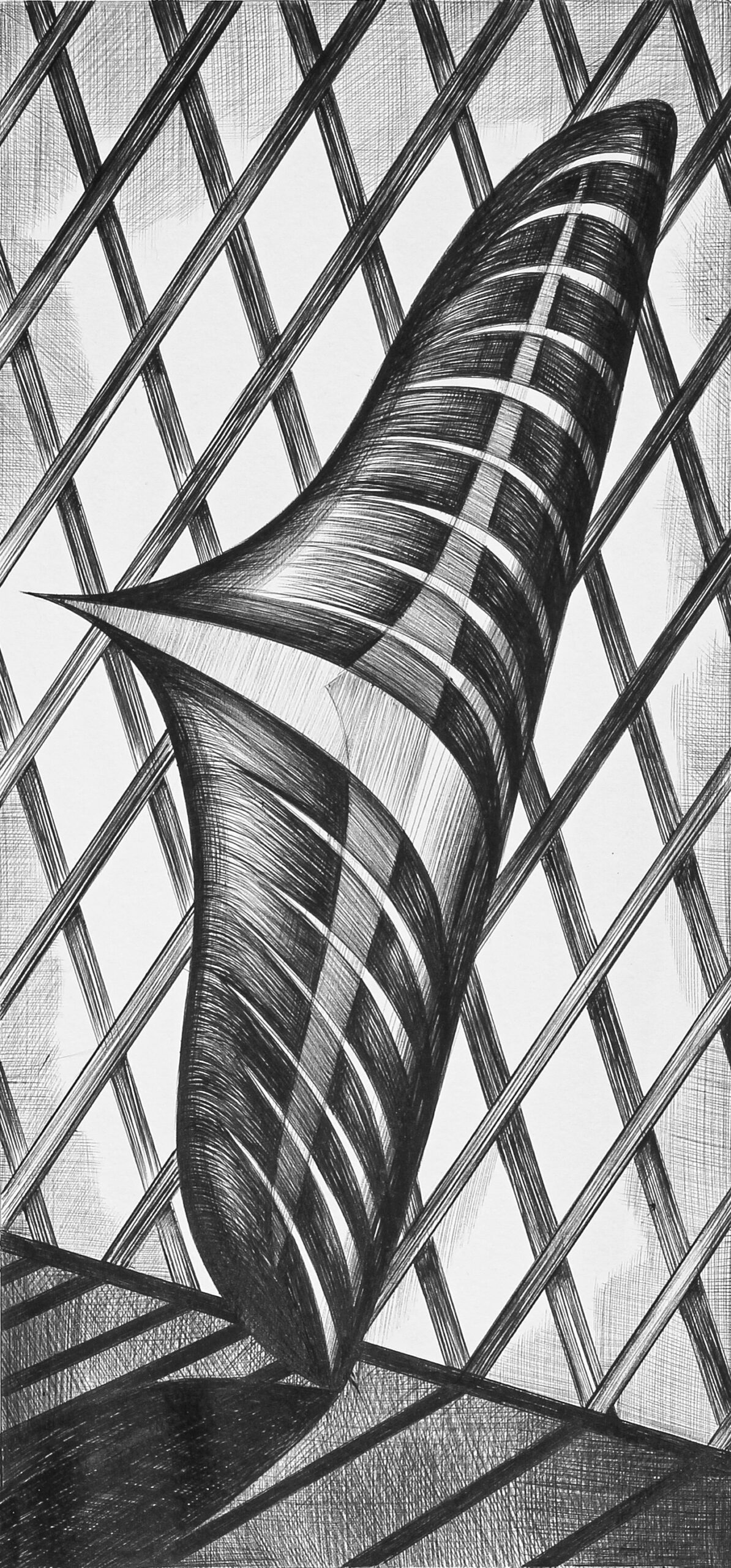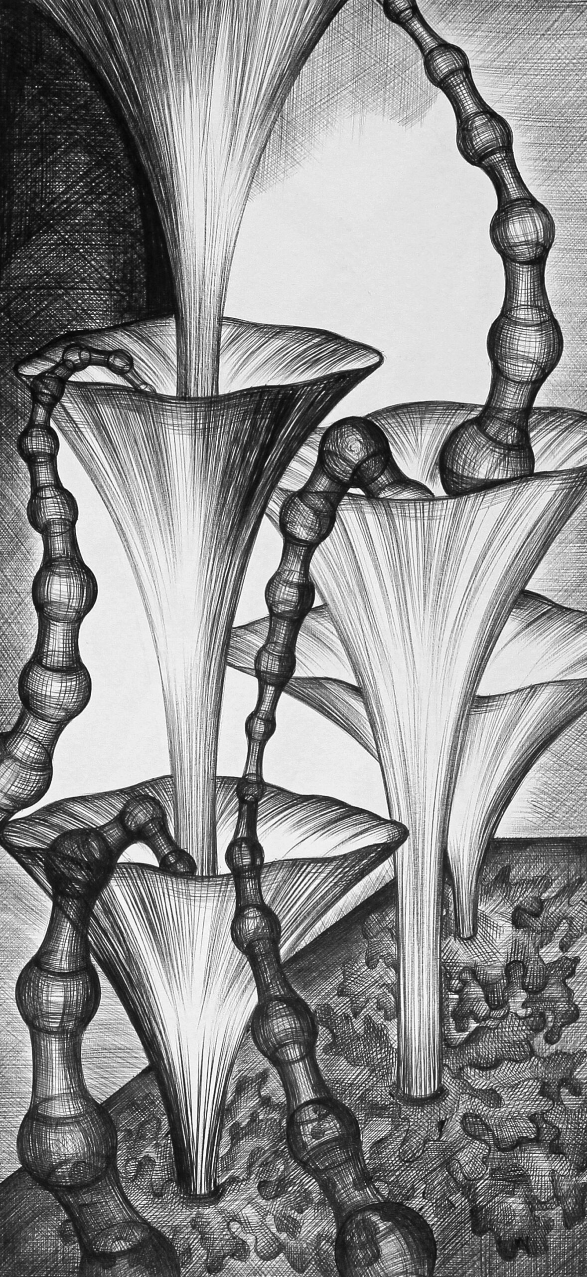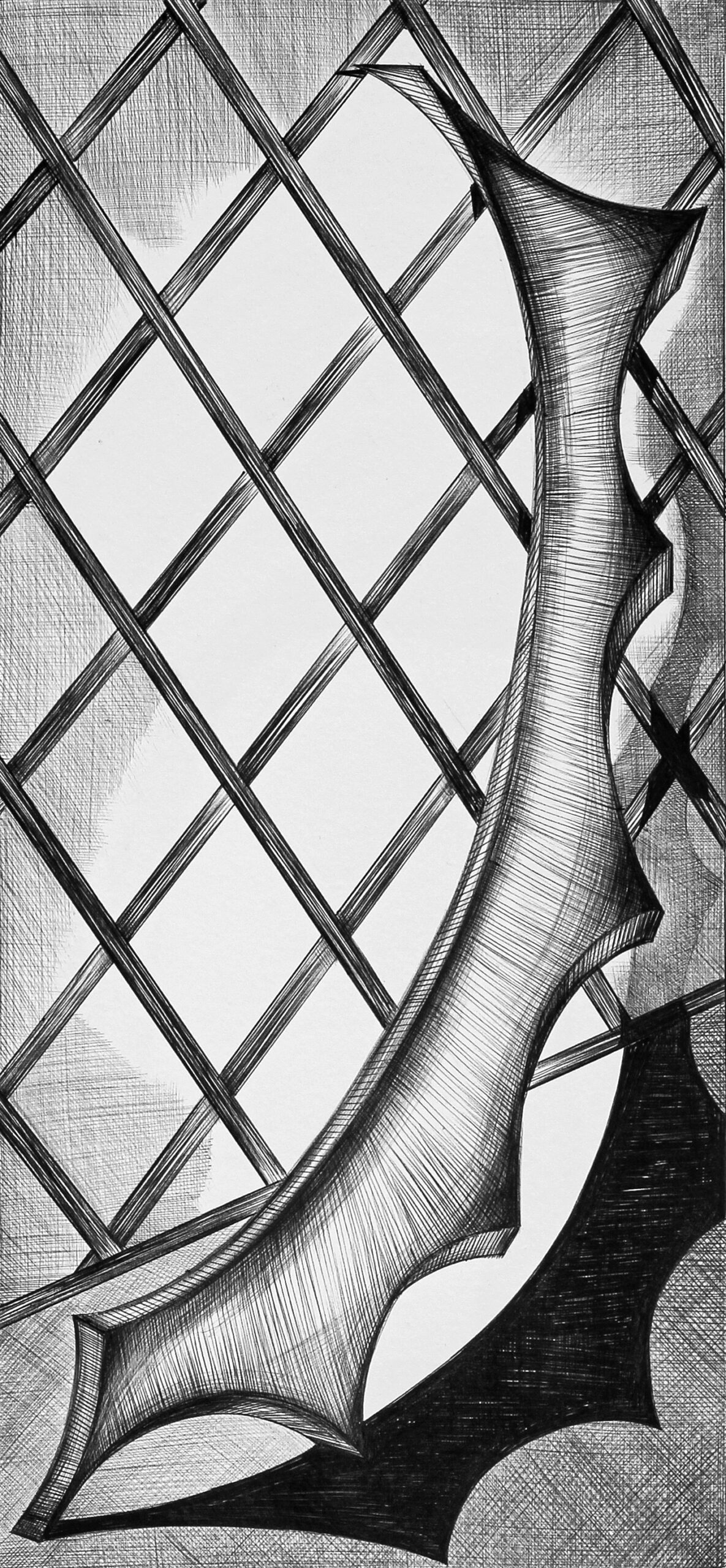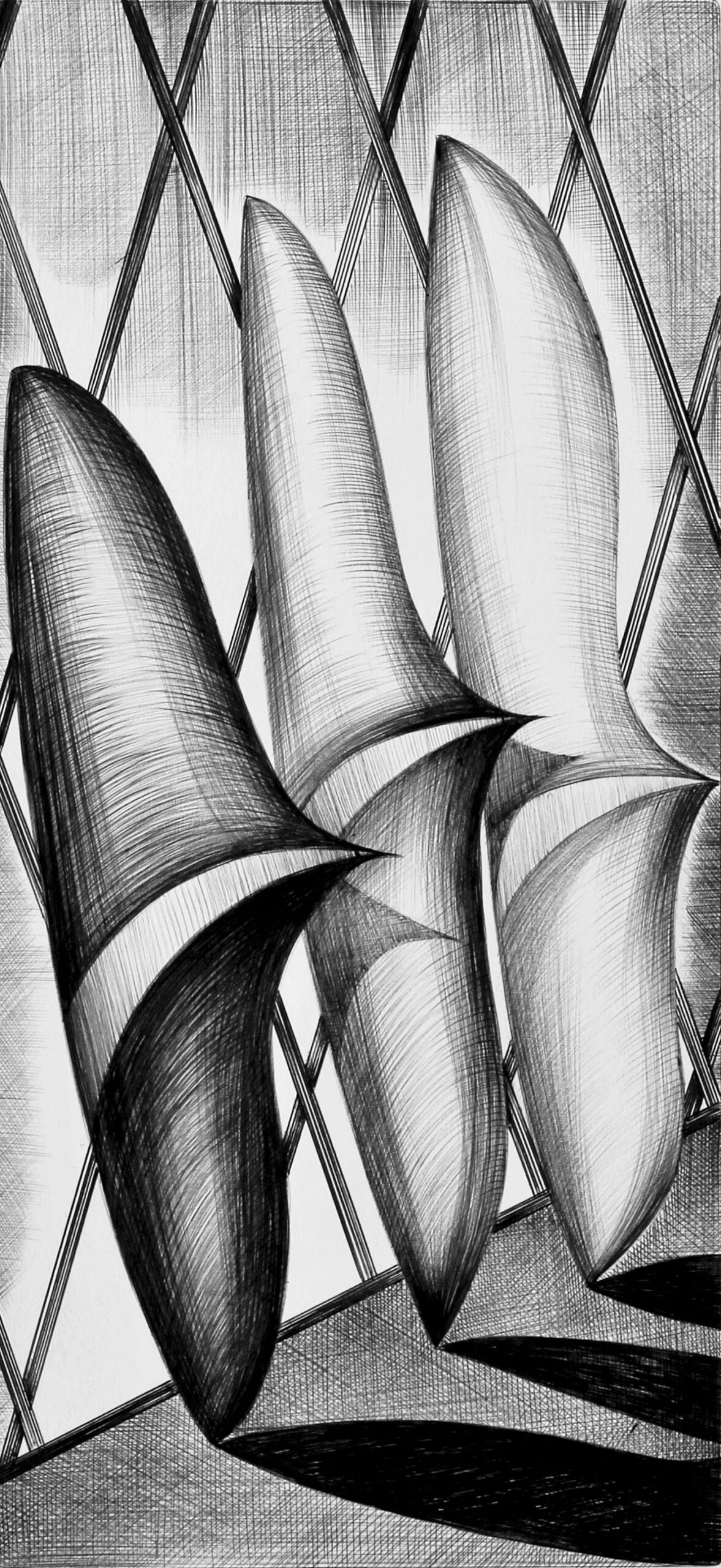 De MODERNIST zijn deeltekeningen van een stengel met een opgeblazen vruchtvorm en een harde hoekige stekelvorm. In meerdere varianten onderzoekt Henri deze relatie opnieuw waarbij de spanning tussen de twee elementen opvalt.
