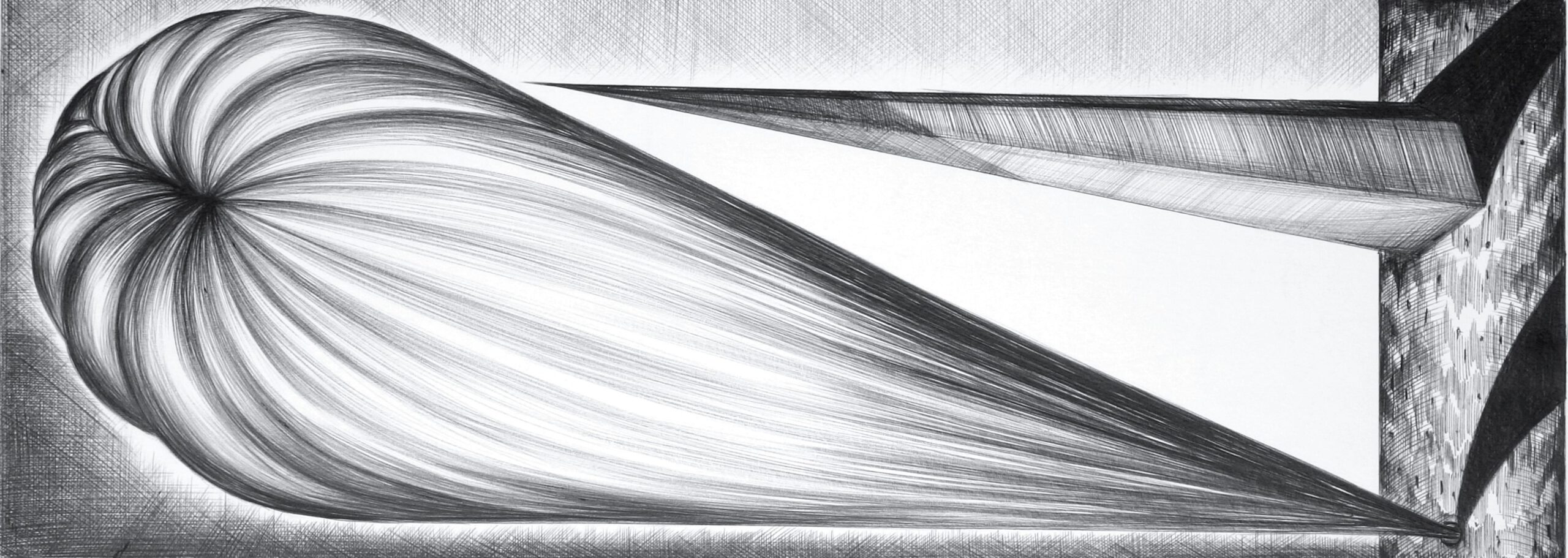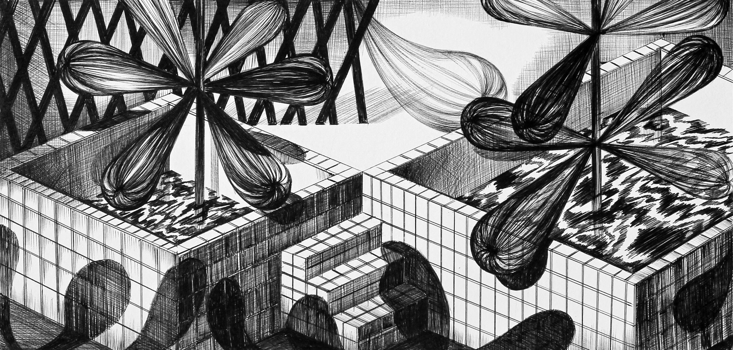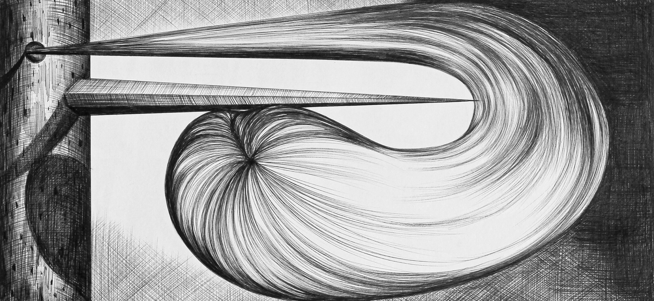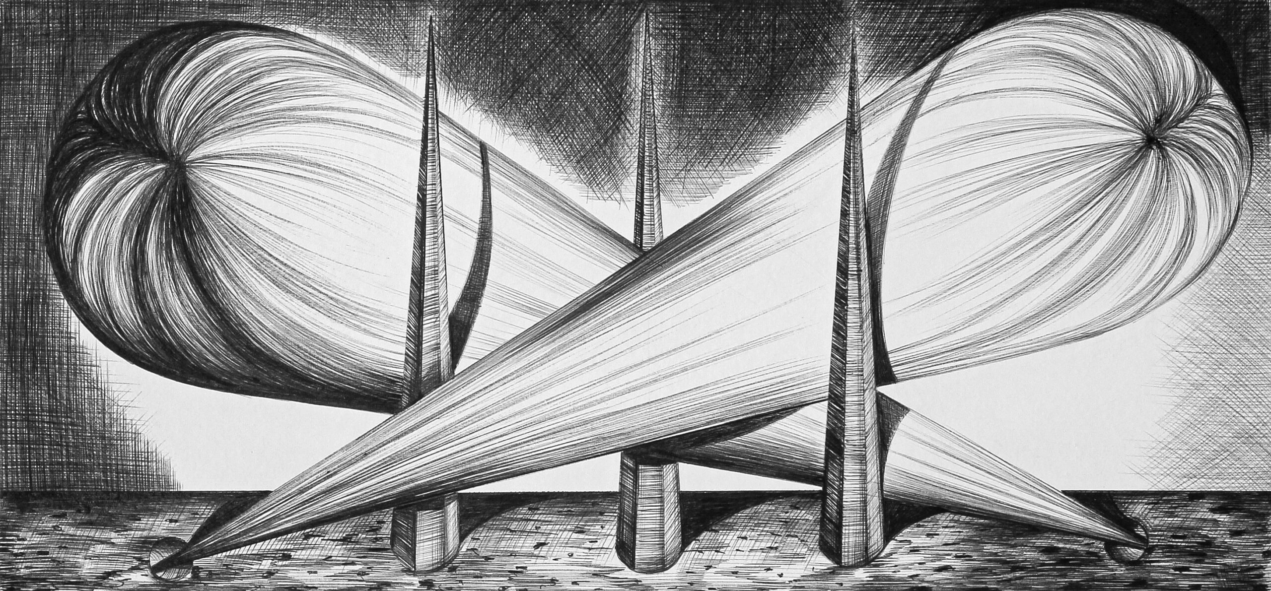 De MODERNIST zijn deeltekeningen van een stengel met een opgeblazen vruchtvorm en een harde hoekige stekelvorm. In meerdere varianten onderzoekt Henri deze relatie opnieuw waarbij de spanning tussen de twee elementen opvalt.