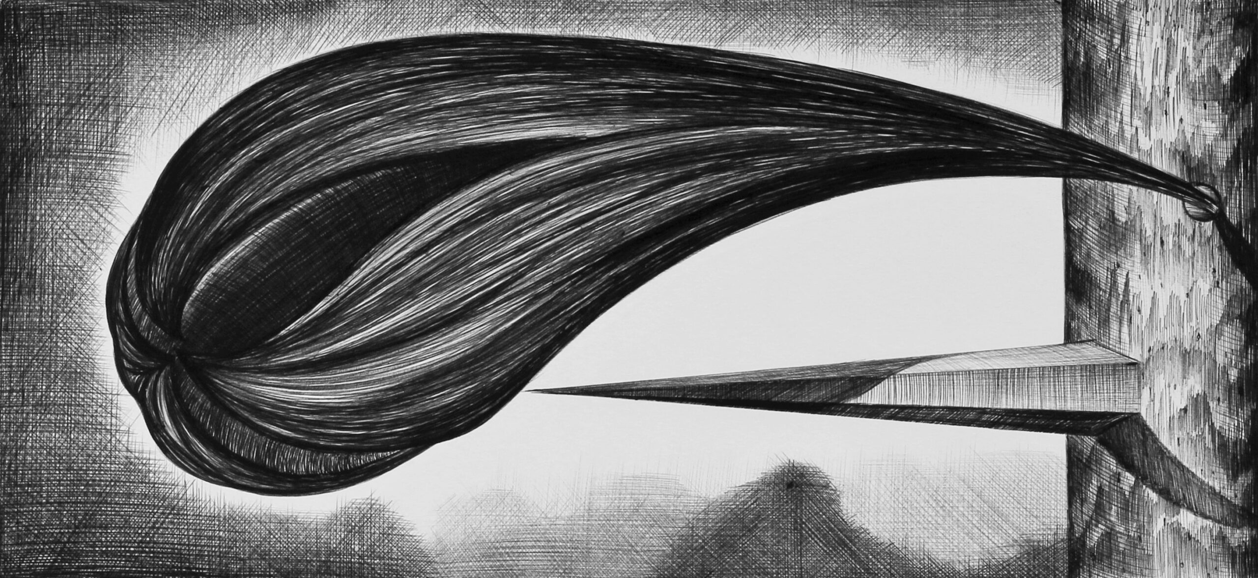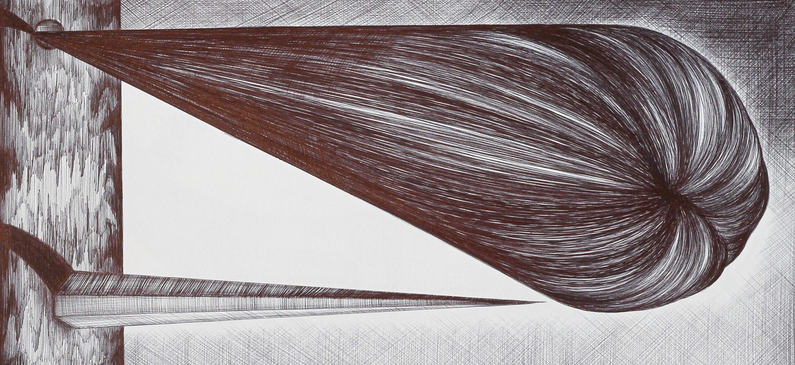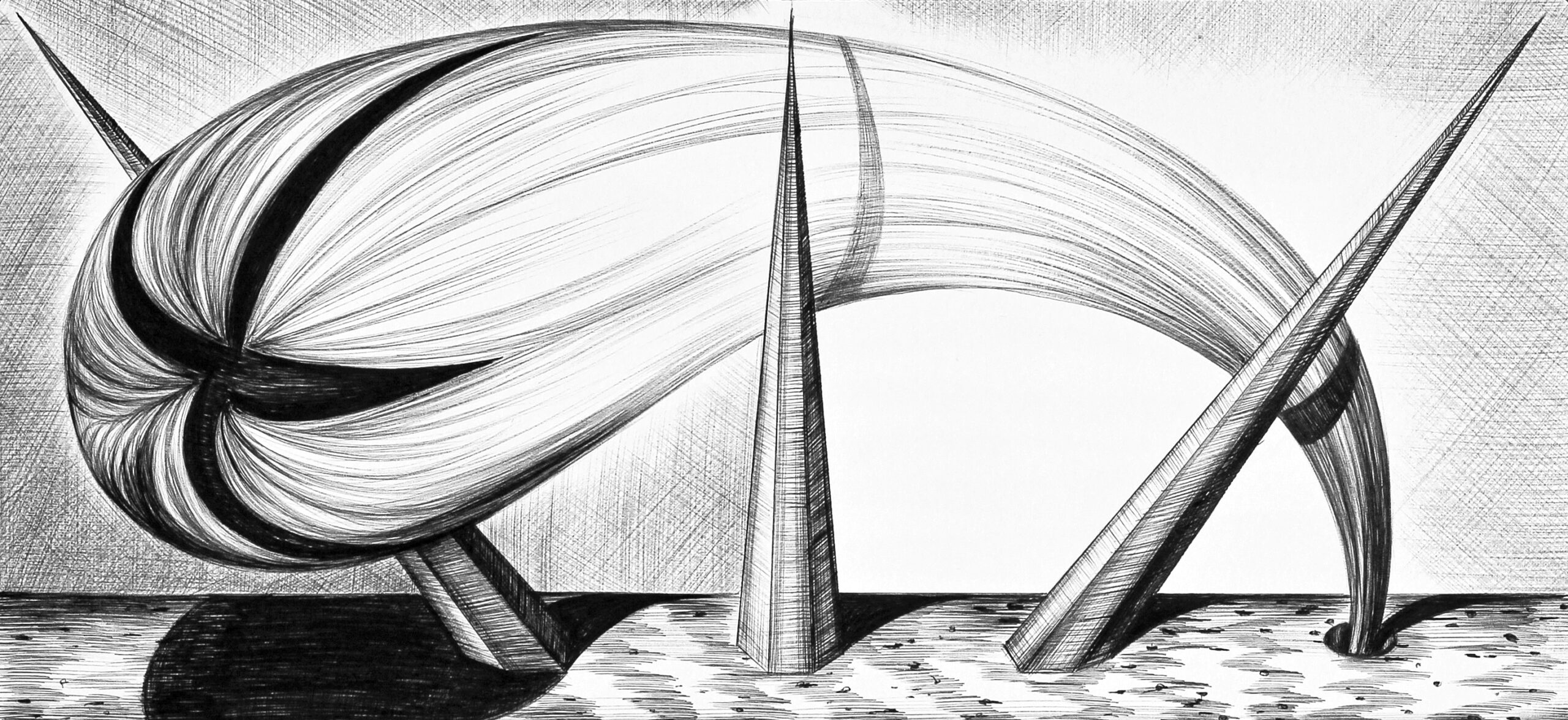 Uitvoering: balpen zwart op 200 grms. tekenpapier/ formaat 32x 50 cm. beeldformaat 22x 40cm.