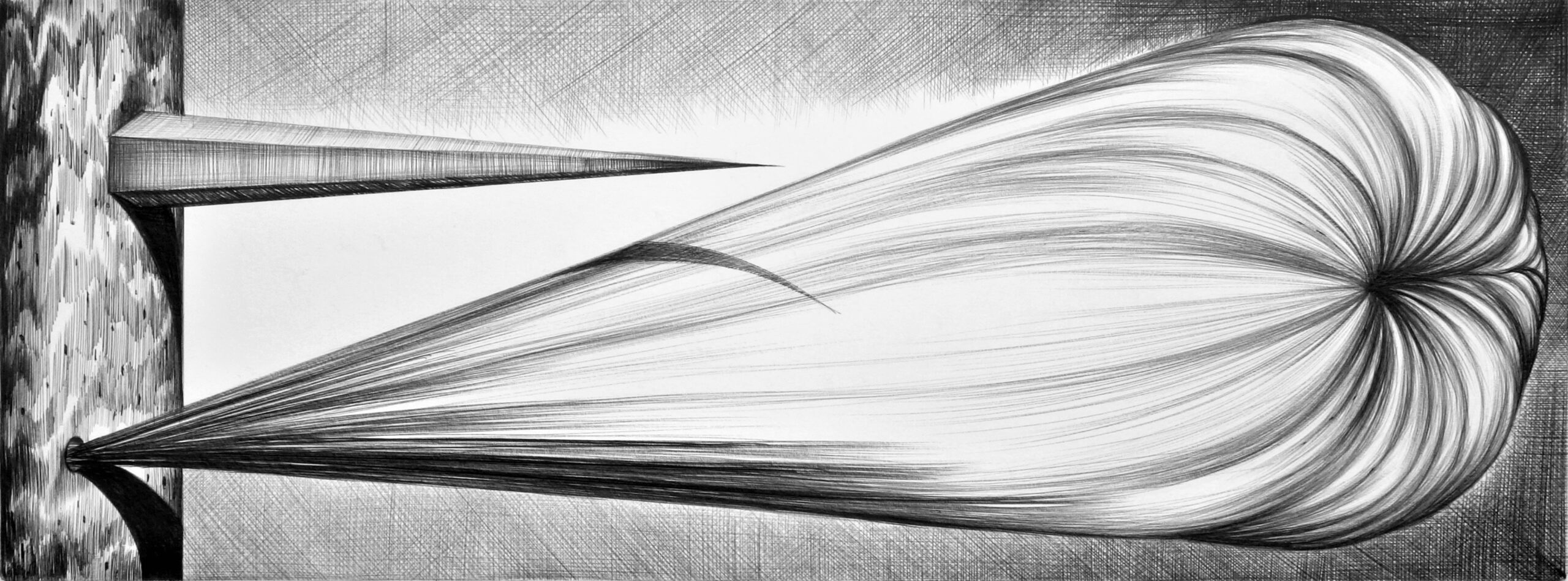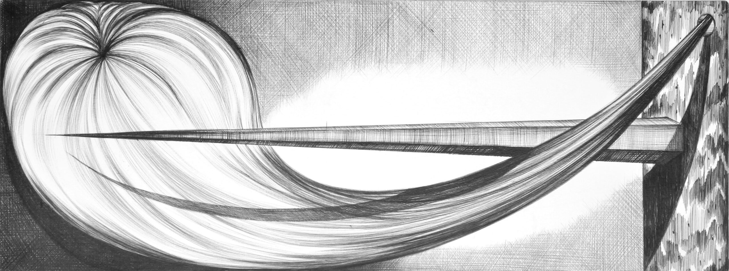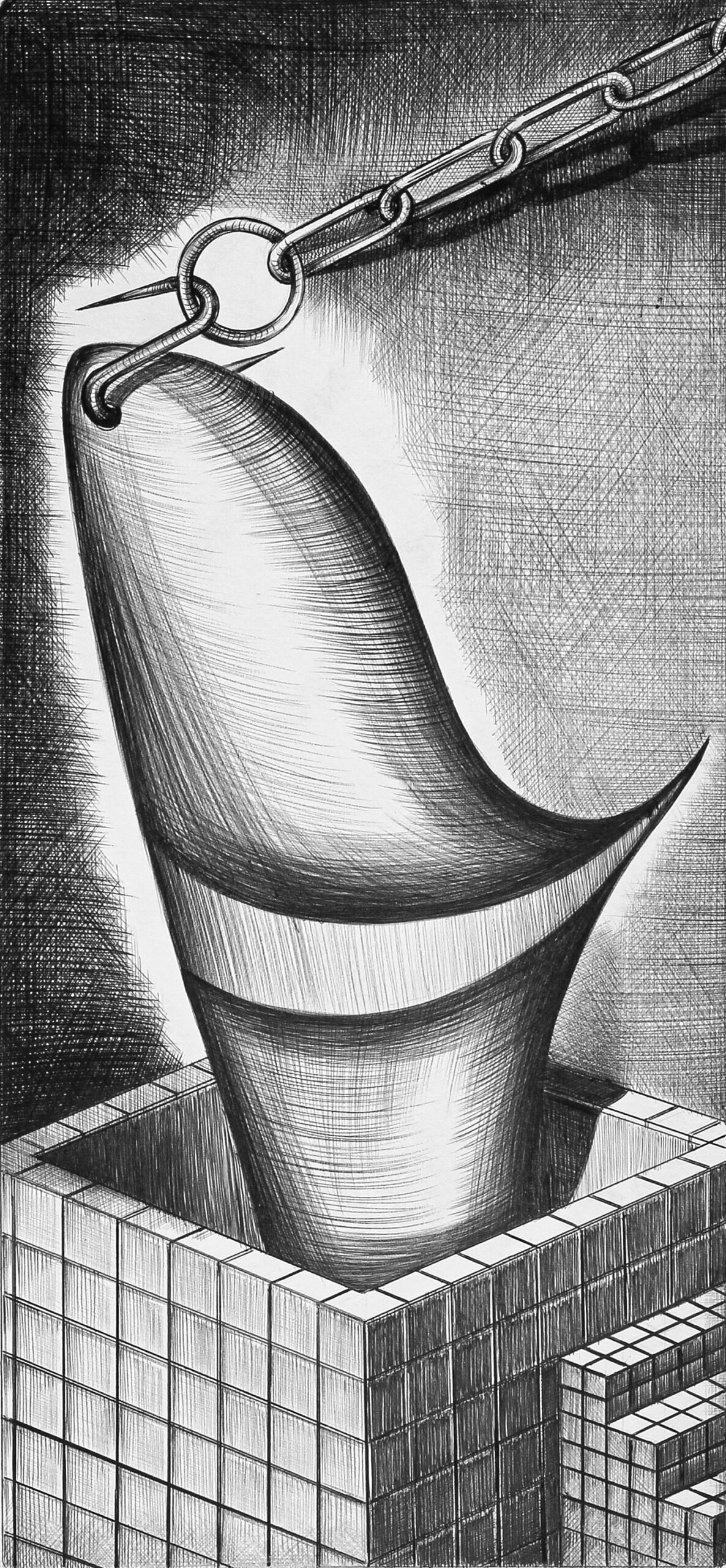 Uitvoering: balpen zwart op 200 grms. tekenpapier/ formaat 32x 50 cm. beeldformaat 22x 40cm.