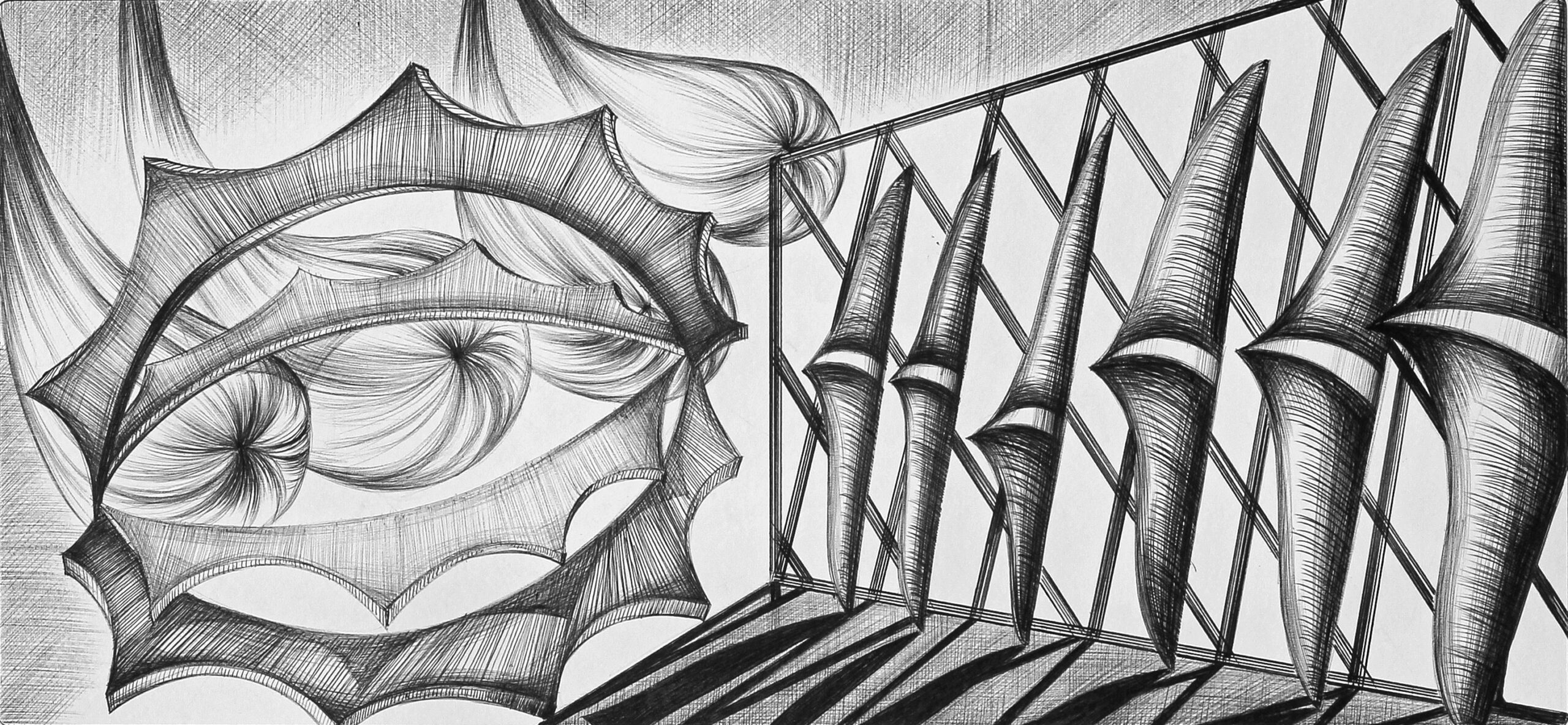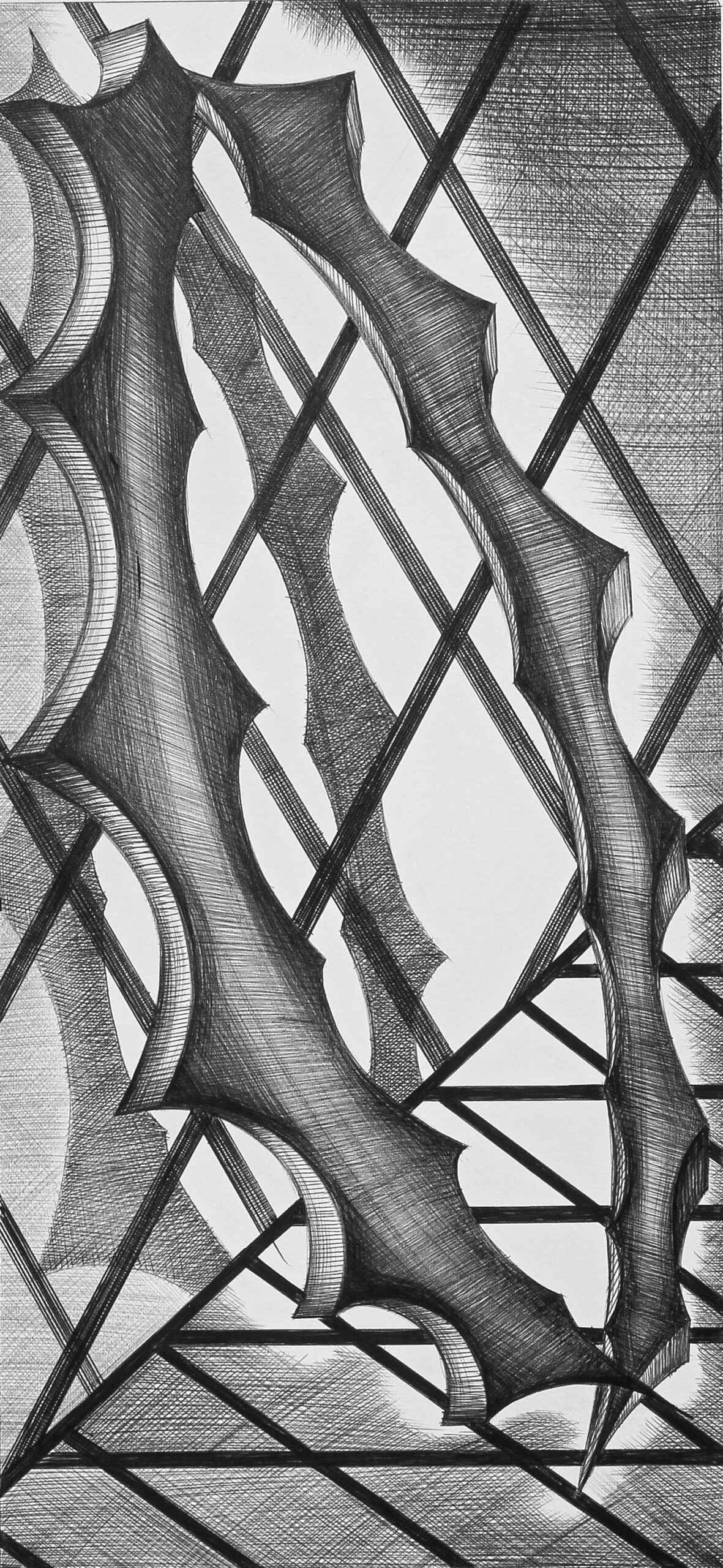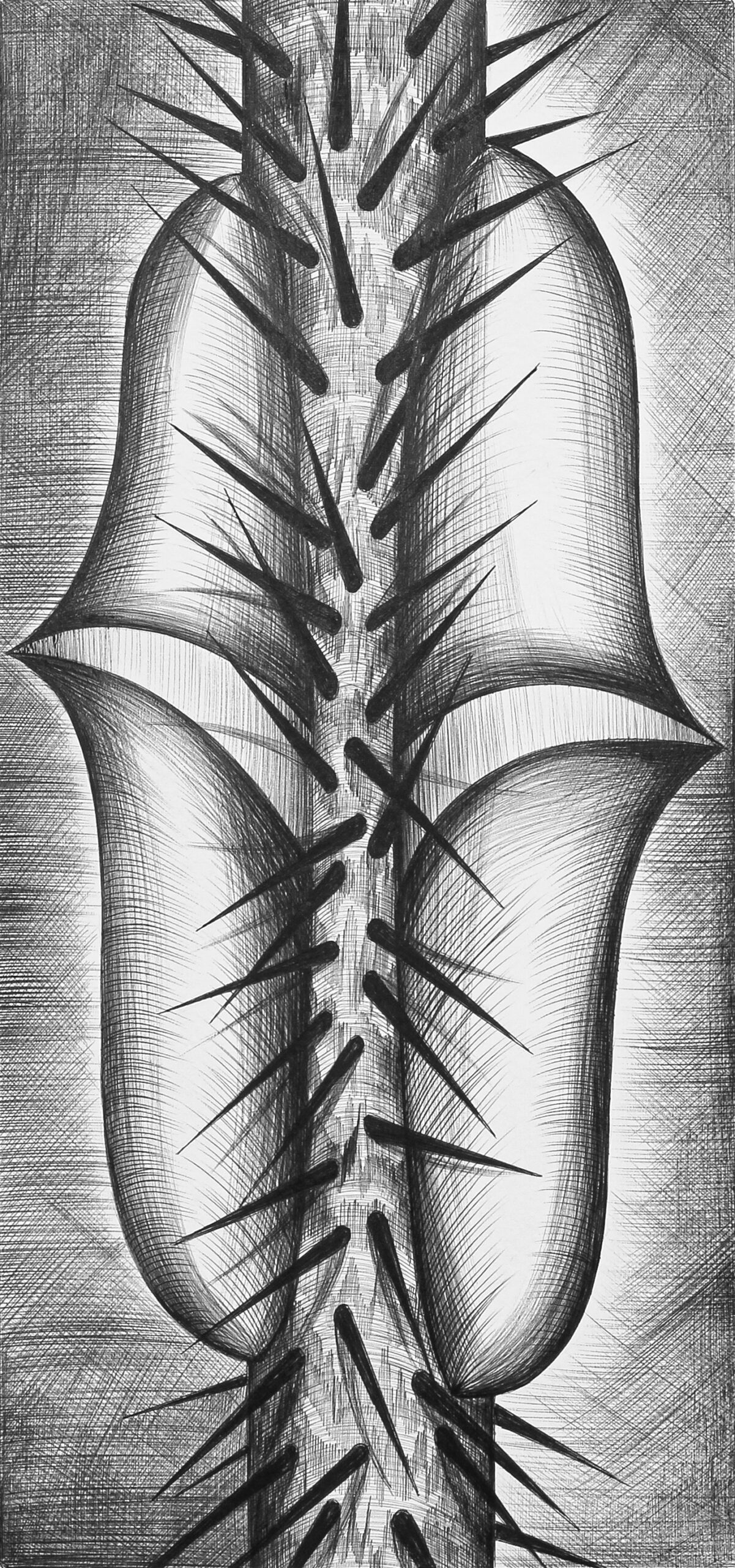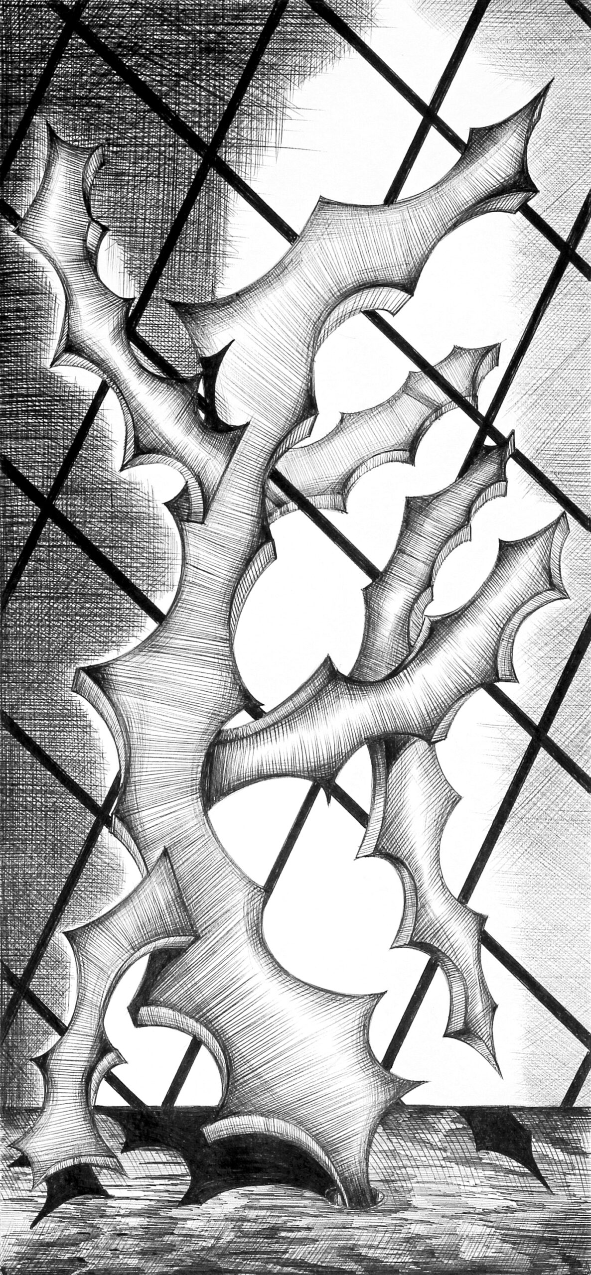 De STEKELS zijn losgemaakt van de plant en verschijnen in de tekeningen als autonome objecten, gepositioneerd tegen een hekwerk.