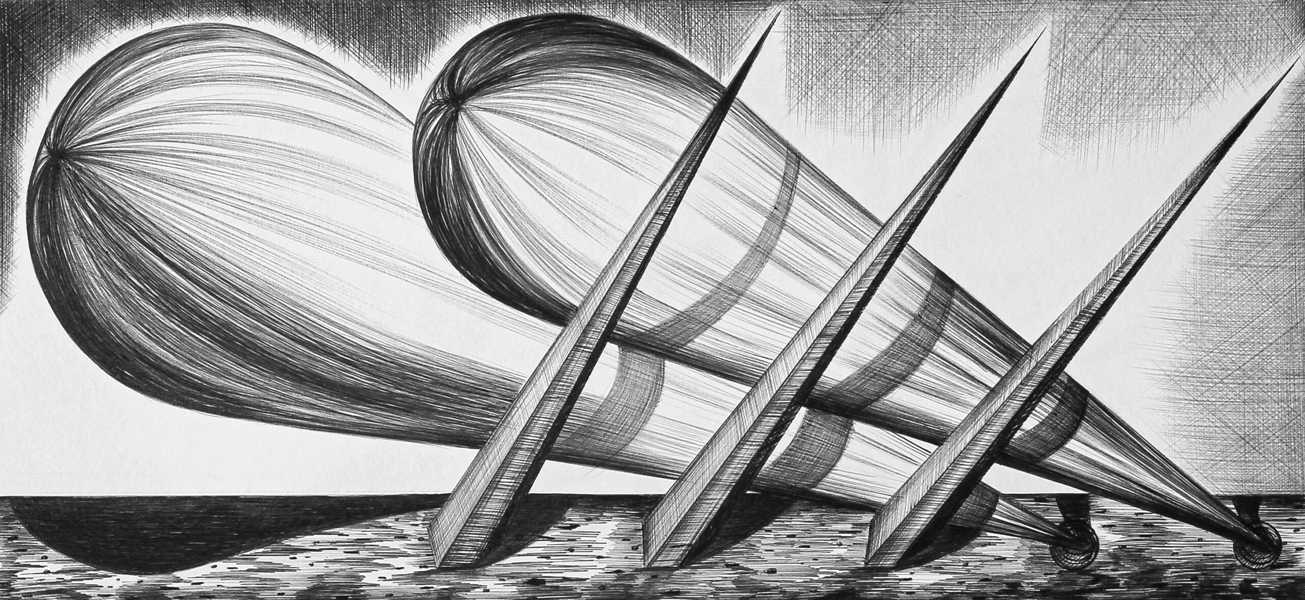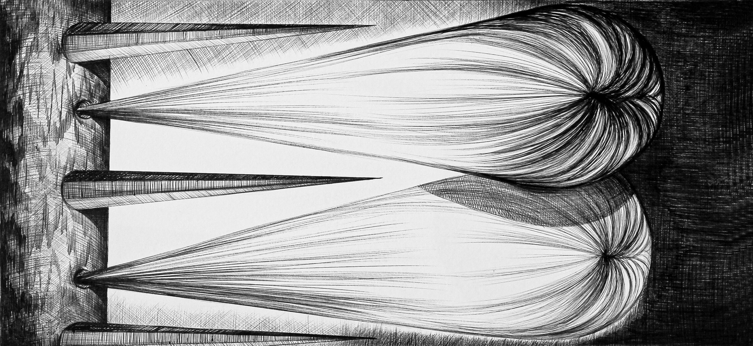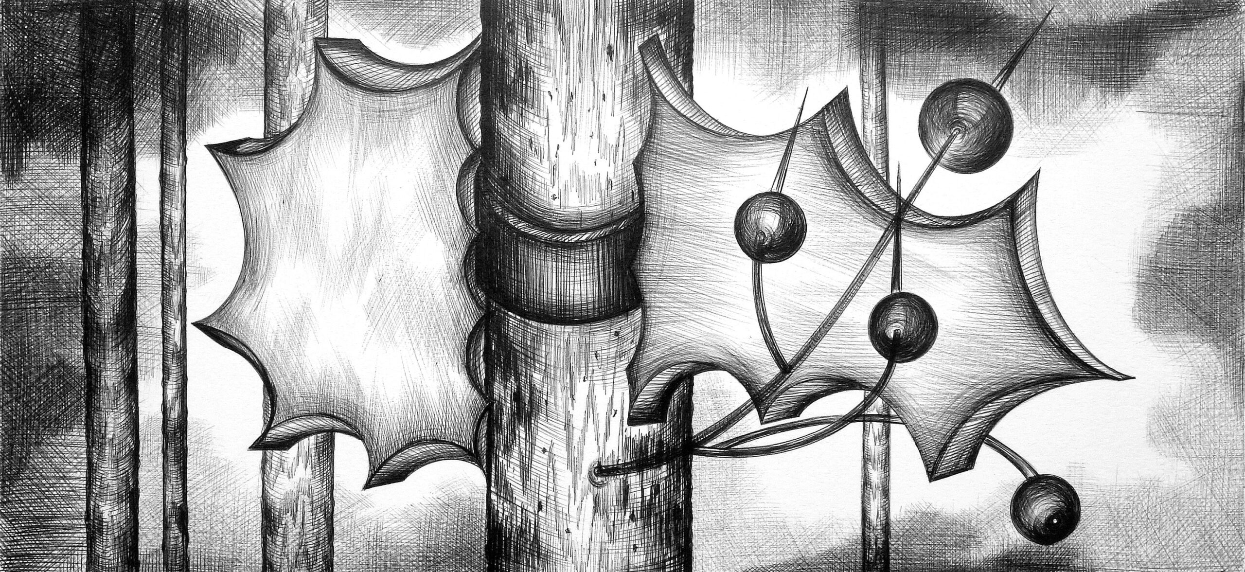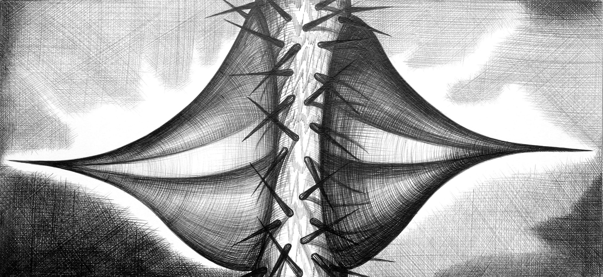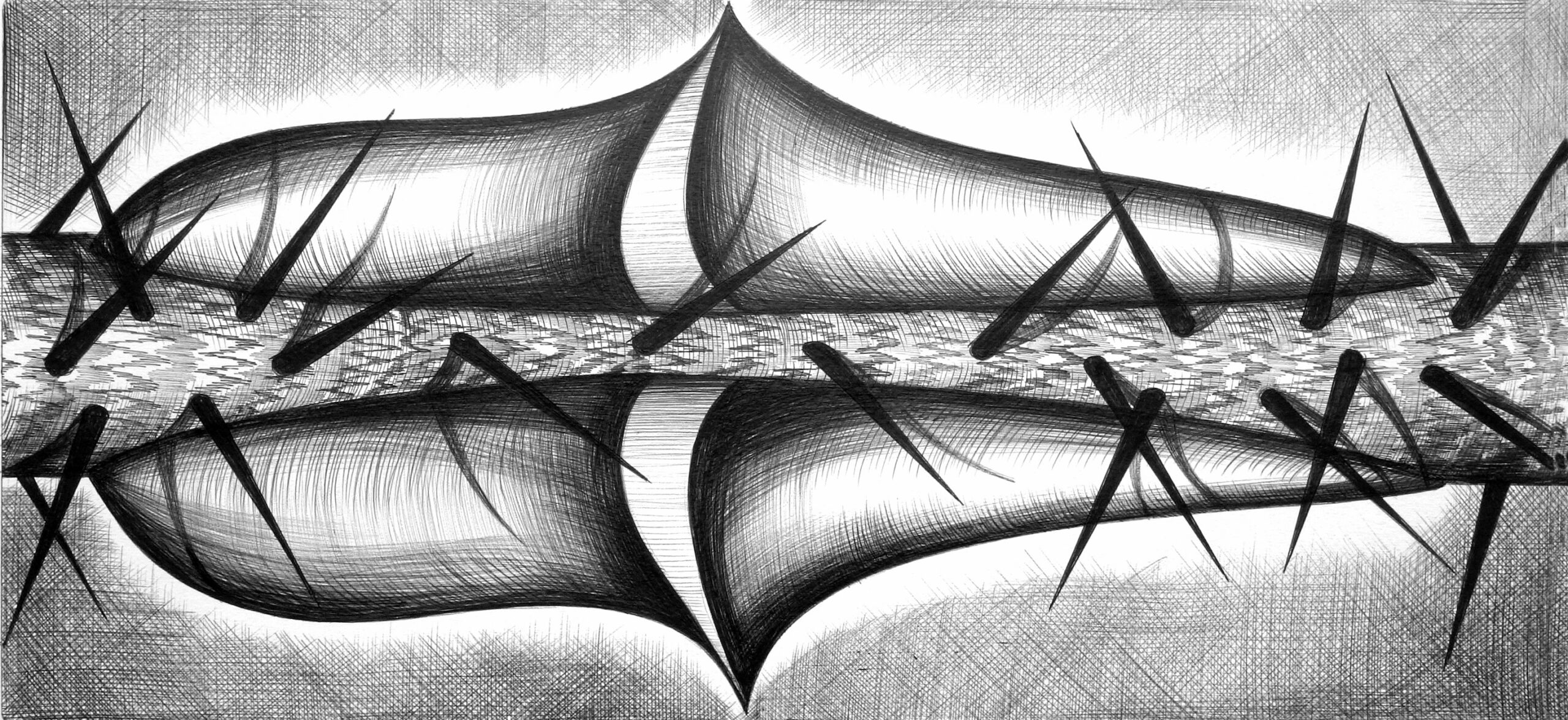 De STEKELS zijn losgemaakt van de plant en verschijnen in de tekeningen als autonome objecten, gepositioneerd tegen een hekwerk.