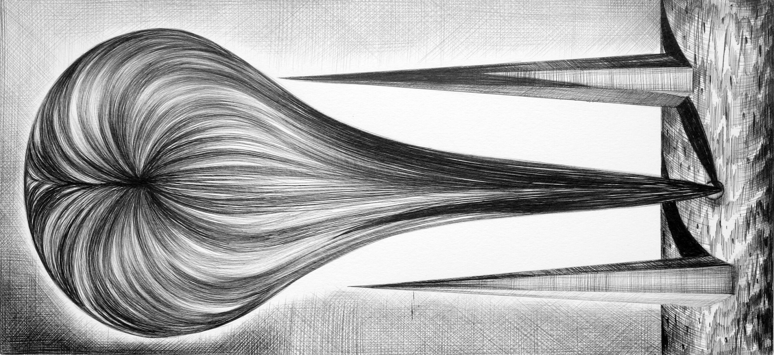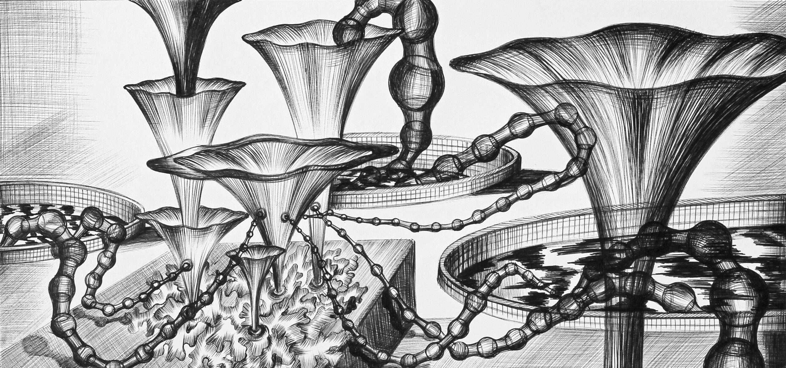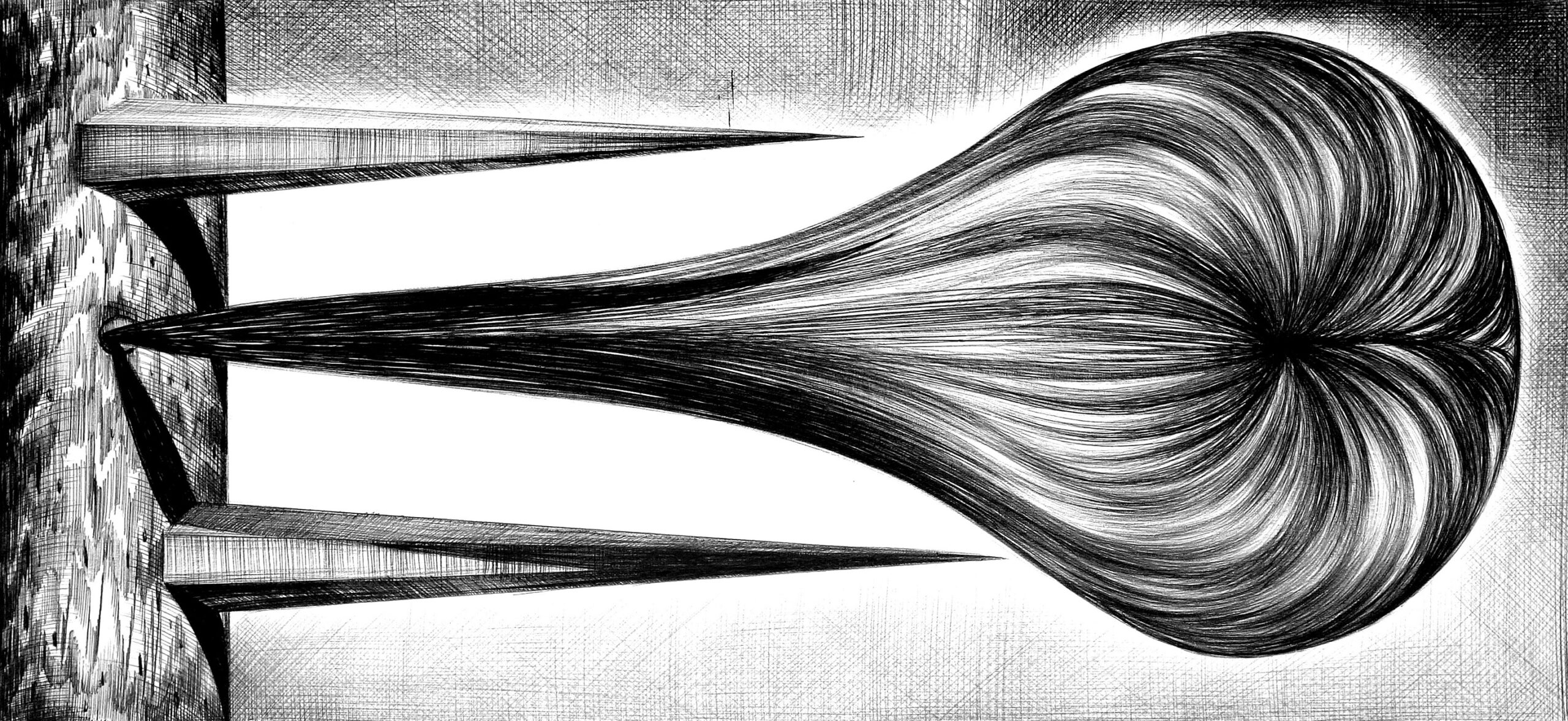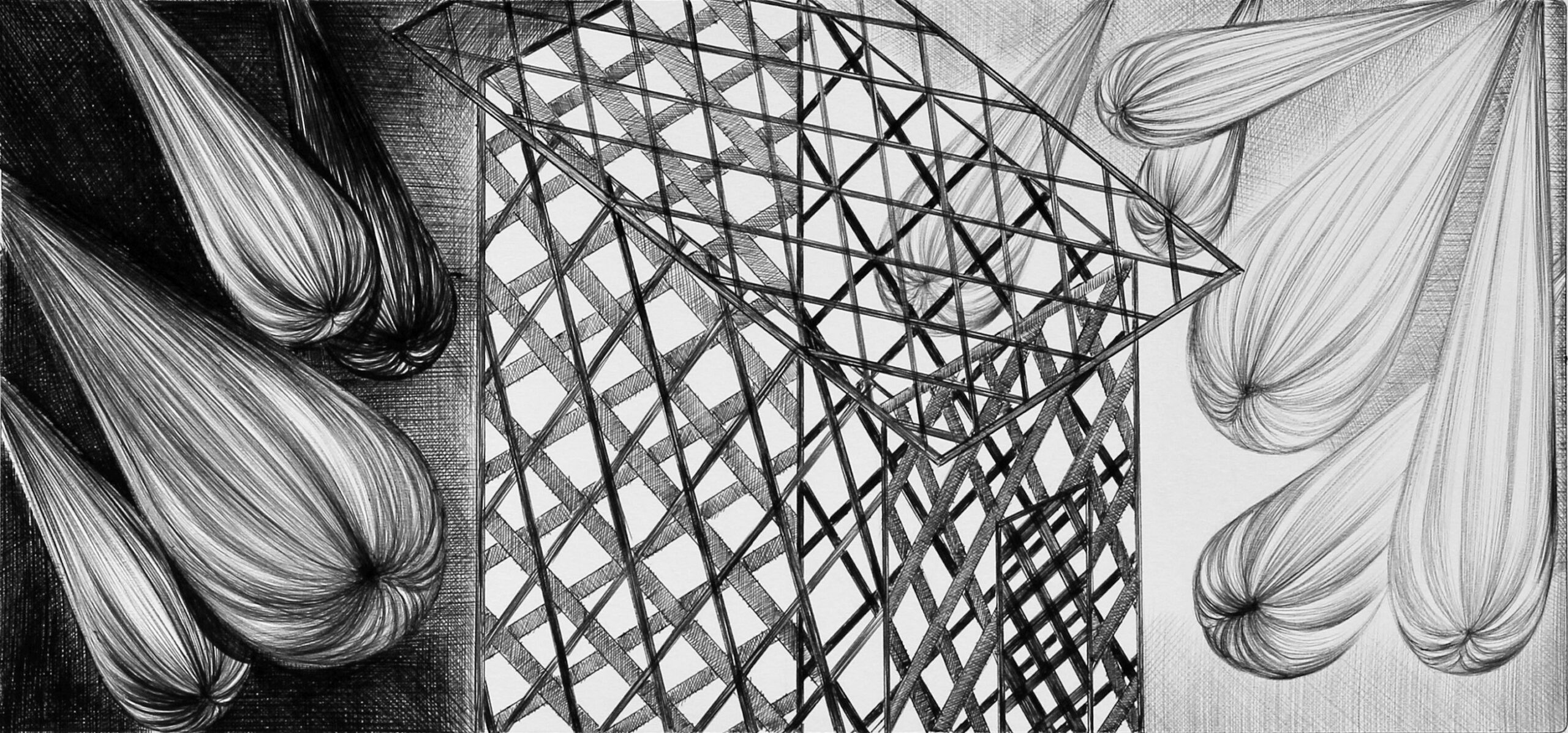 De STEKELS zijn losgemaakt van de plant en verschijnen in de tekeningen als autonome objecten, gepositioneerd tegen een hekwerk.