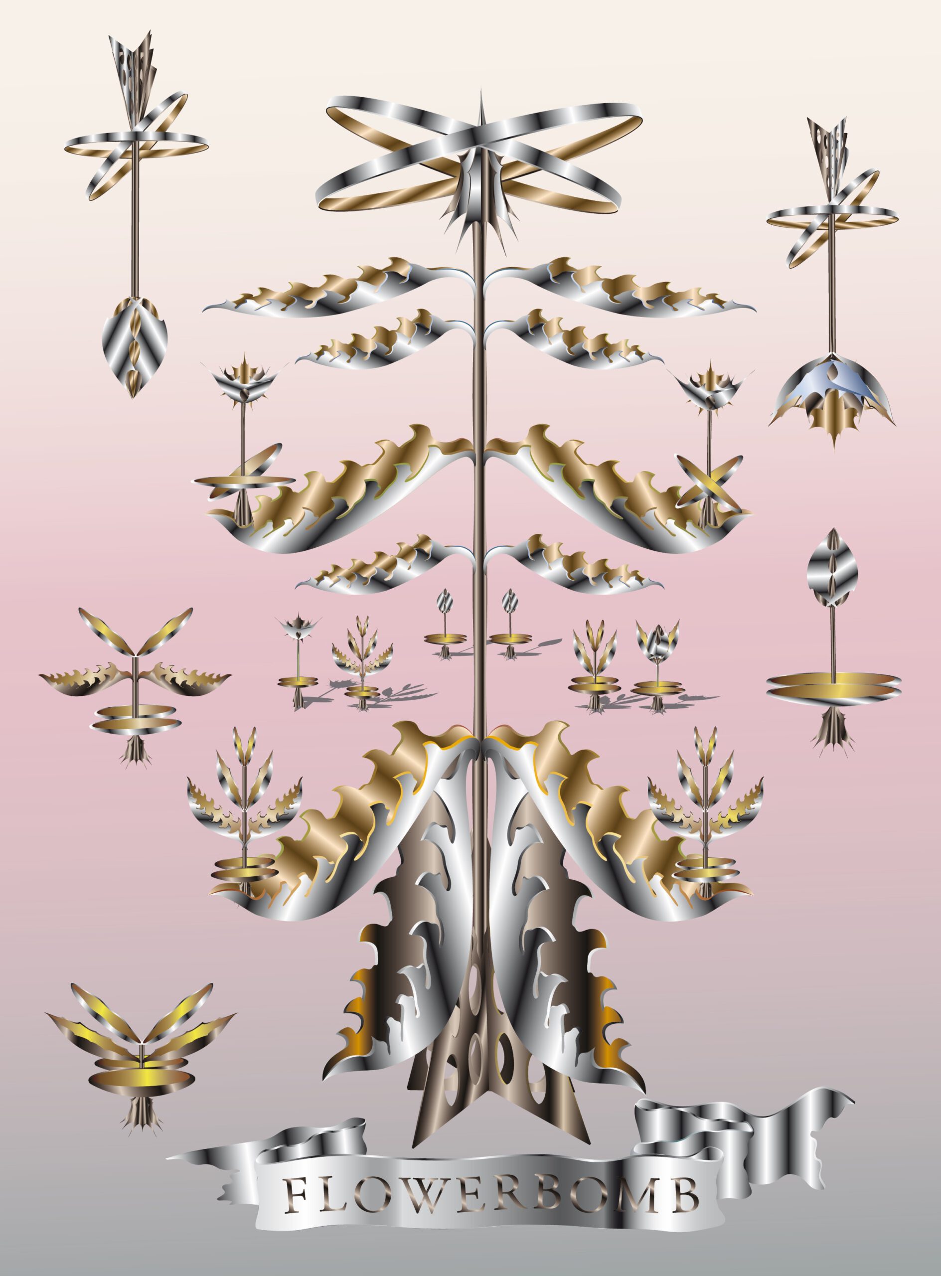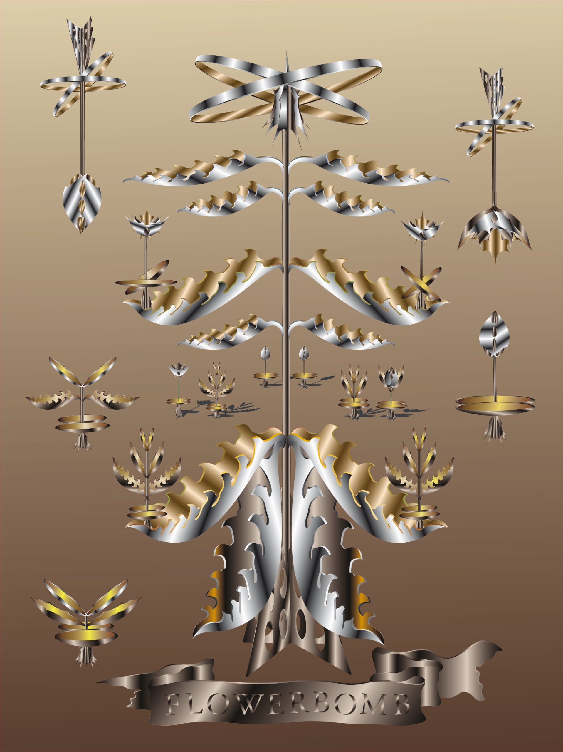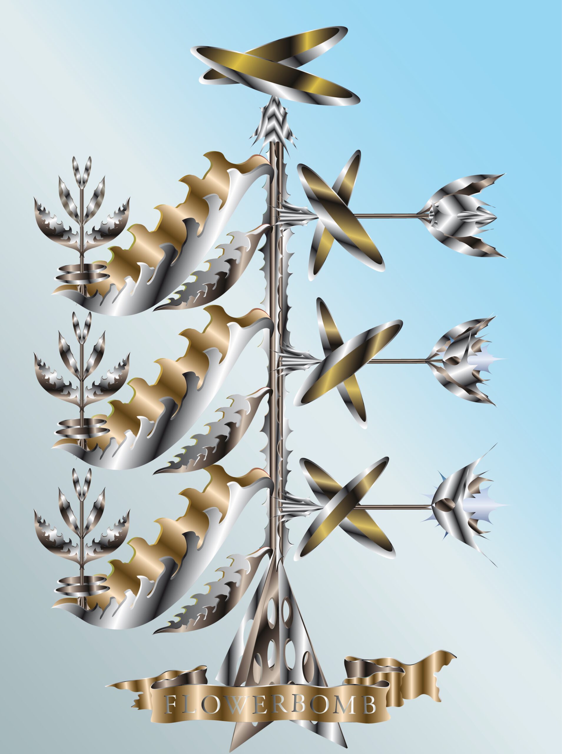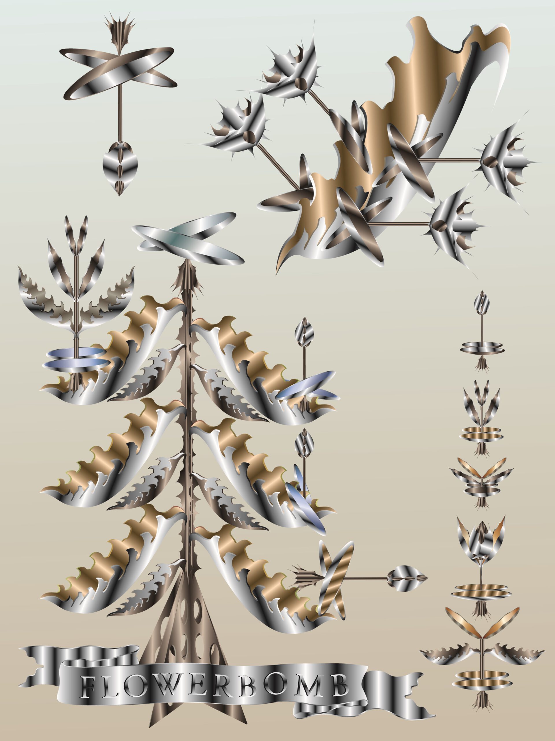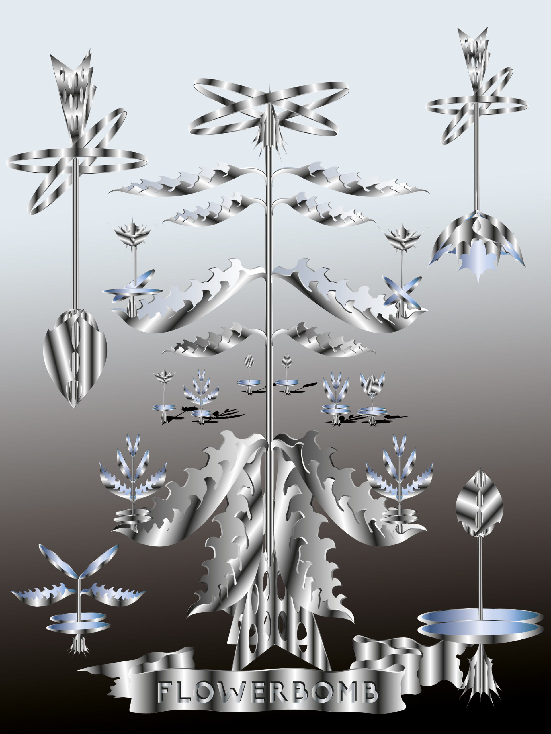 De Flowerbombs zijn statische, onbuigzame artificiële plantmodellen, die hun kracht ontlenen aan hun materiaal metaal.