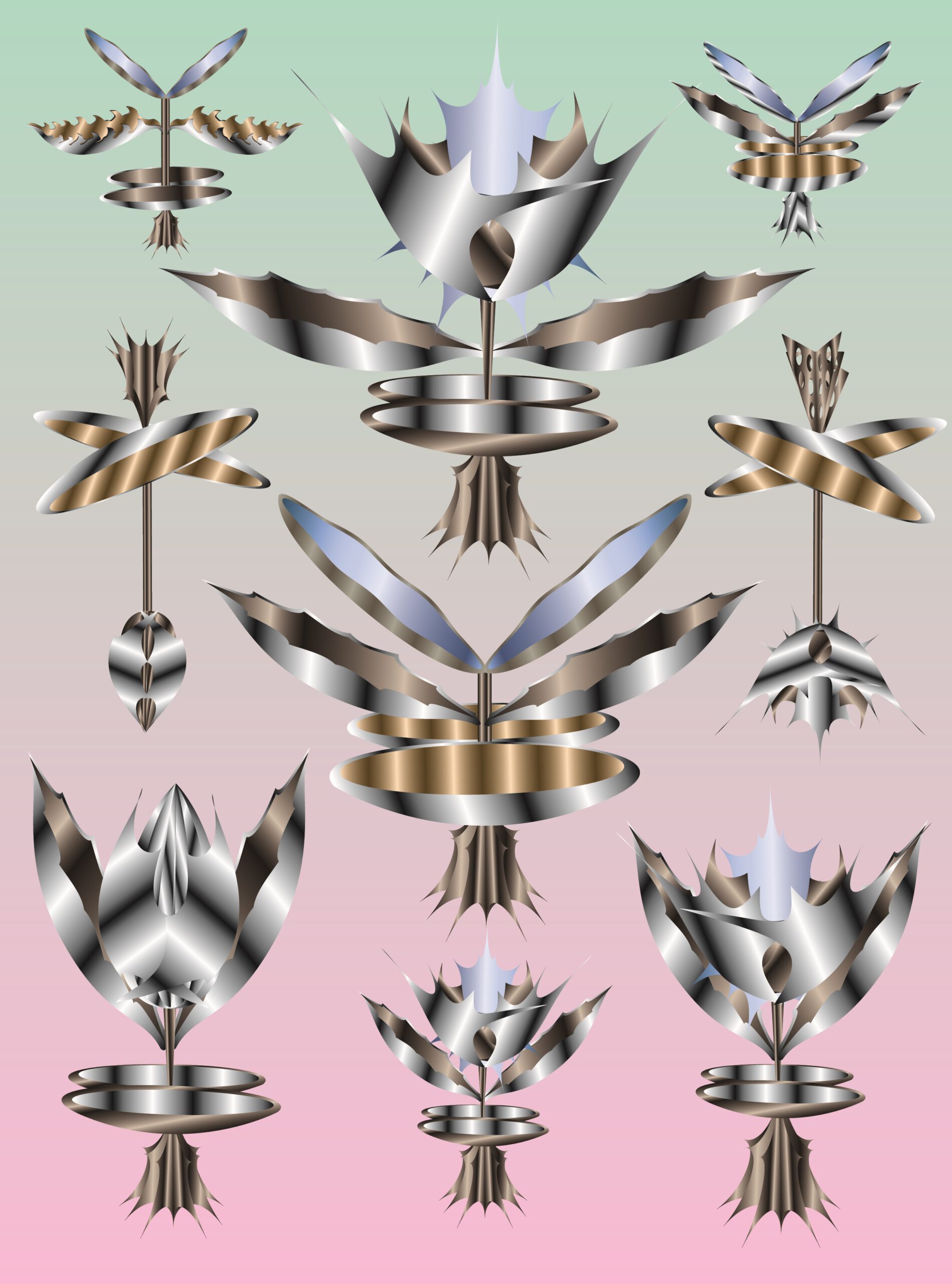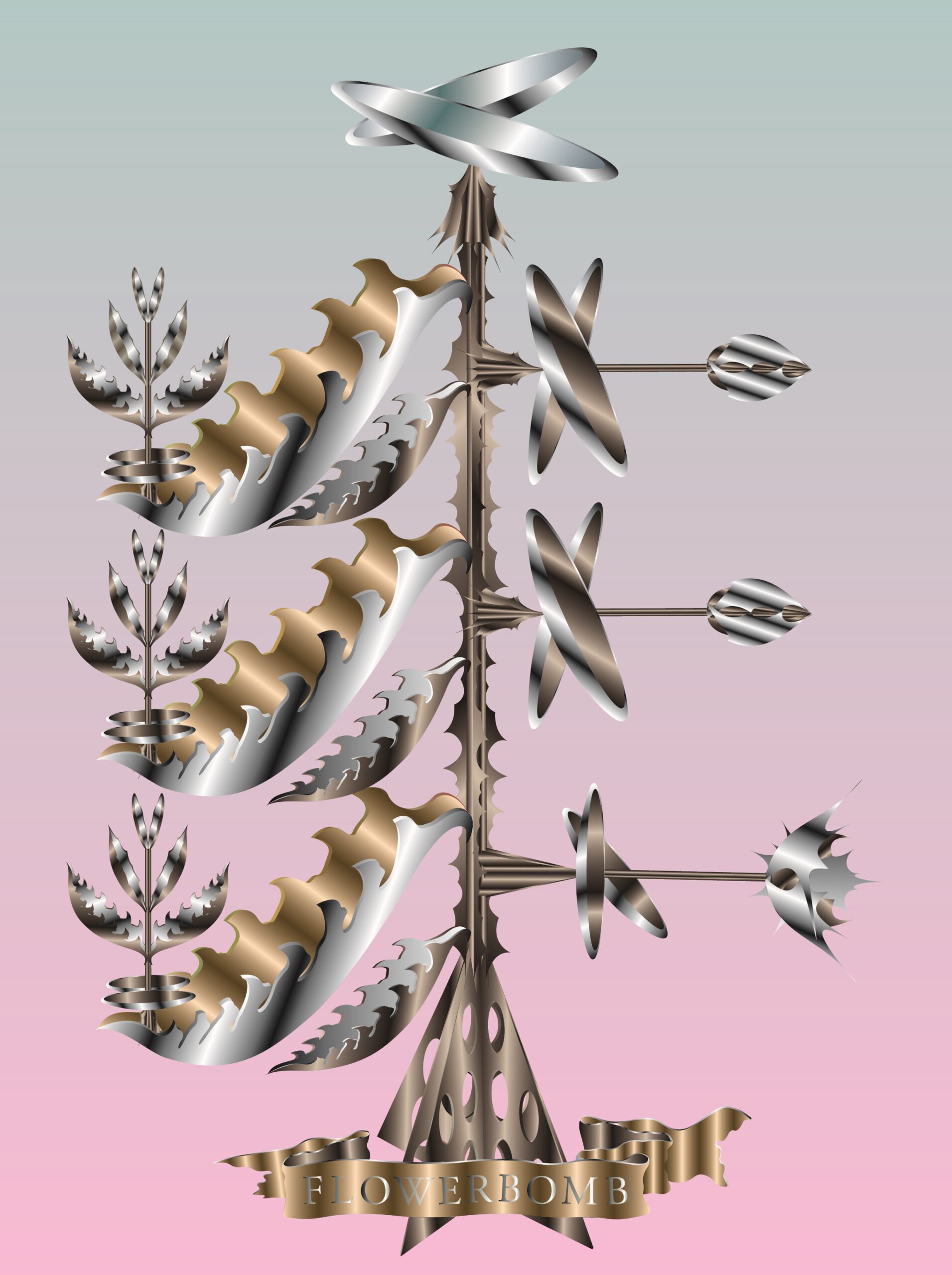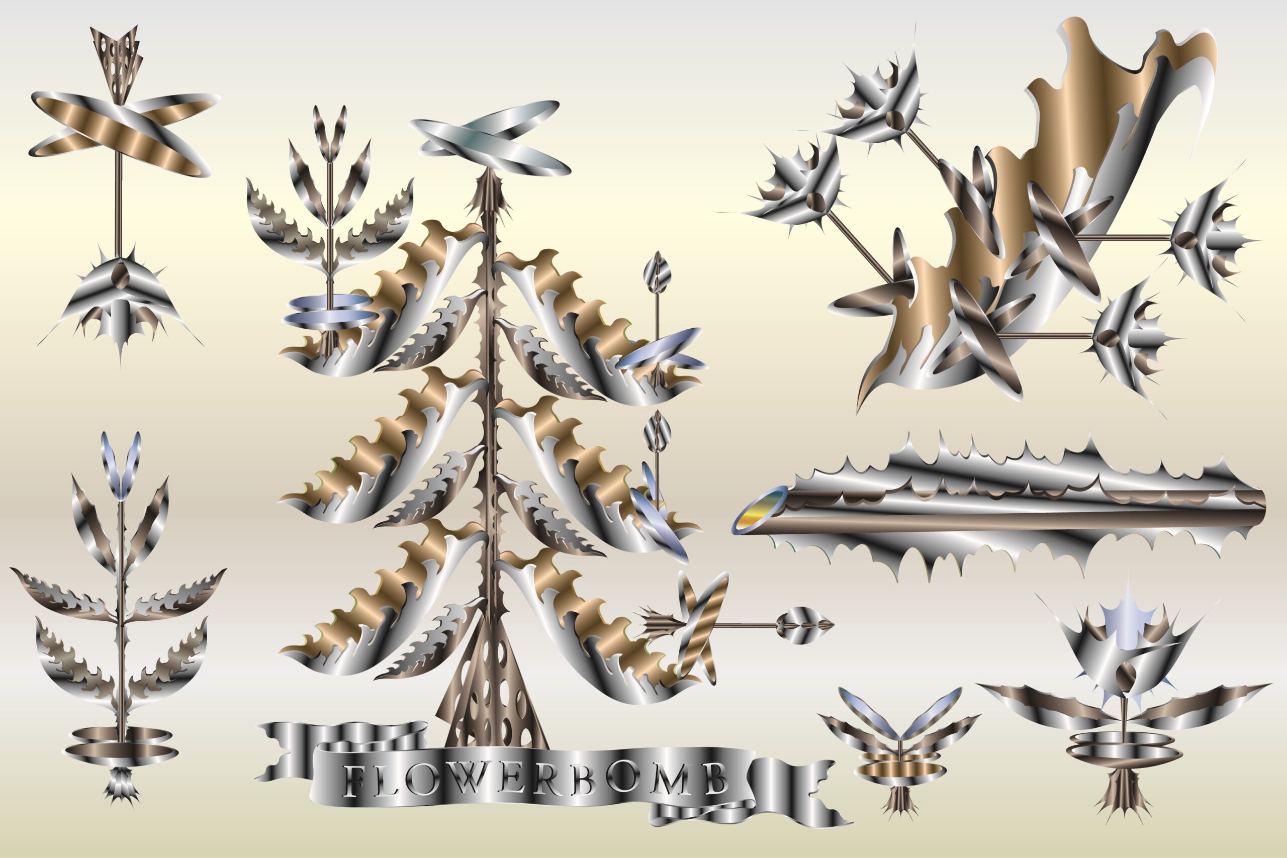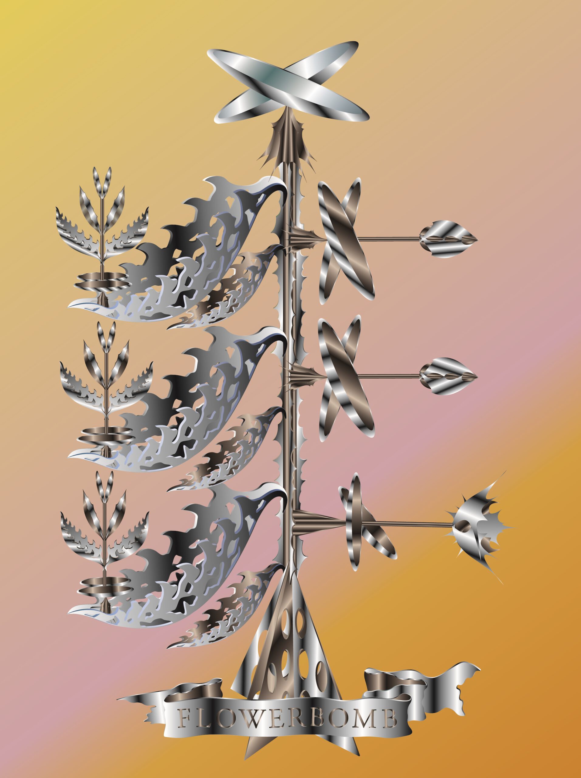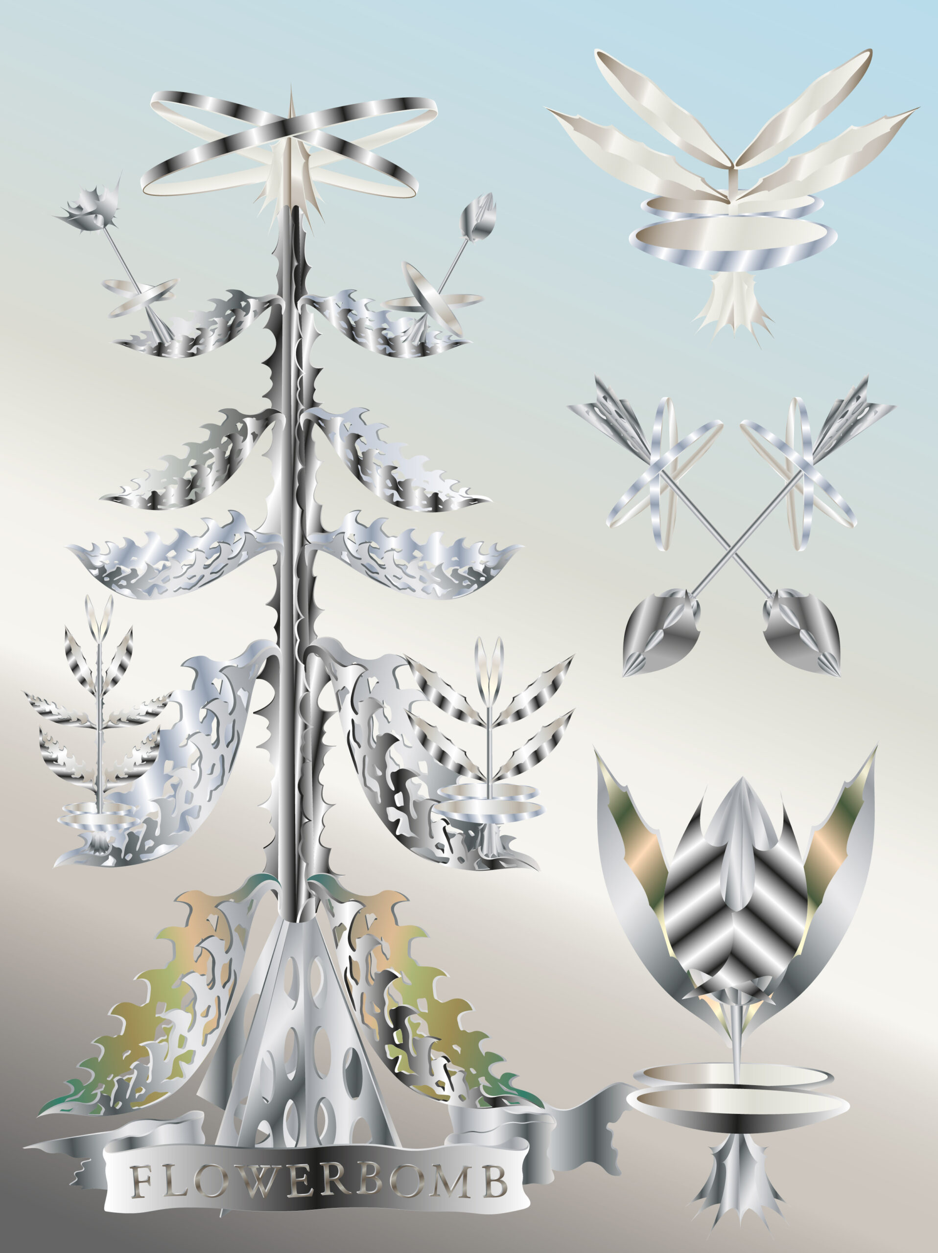De Flowerbombs zijn statische, onbuigzame artificiële plantmodellen, die hun kracht ontlenen aan hun materiaal metaal.