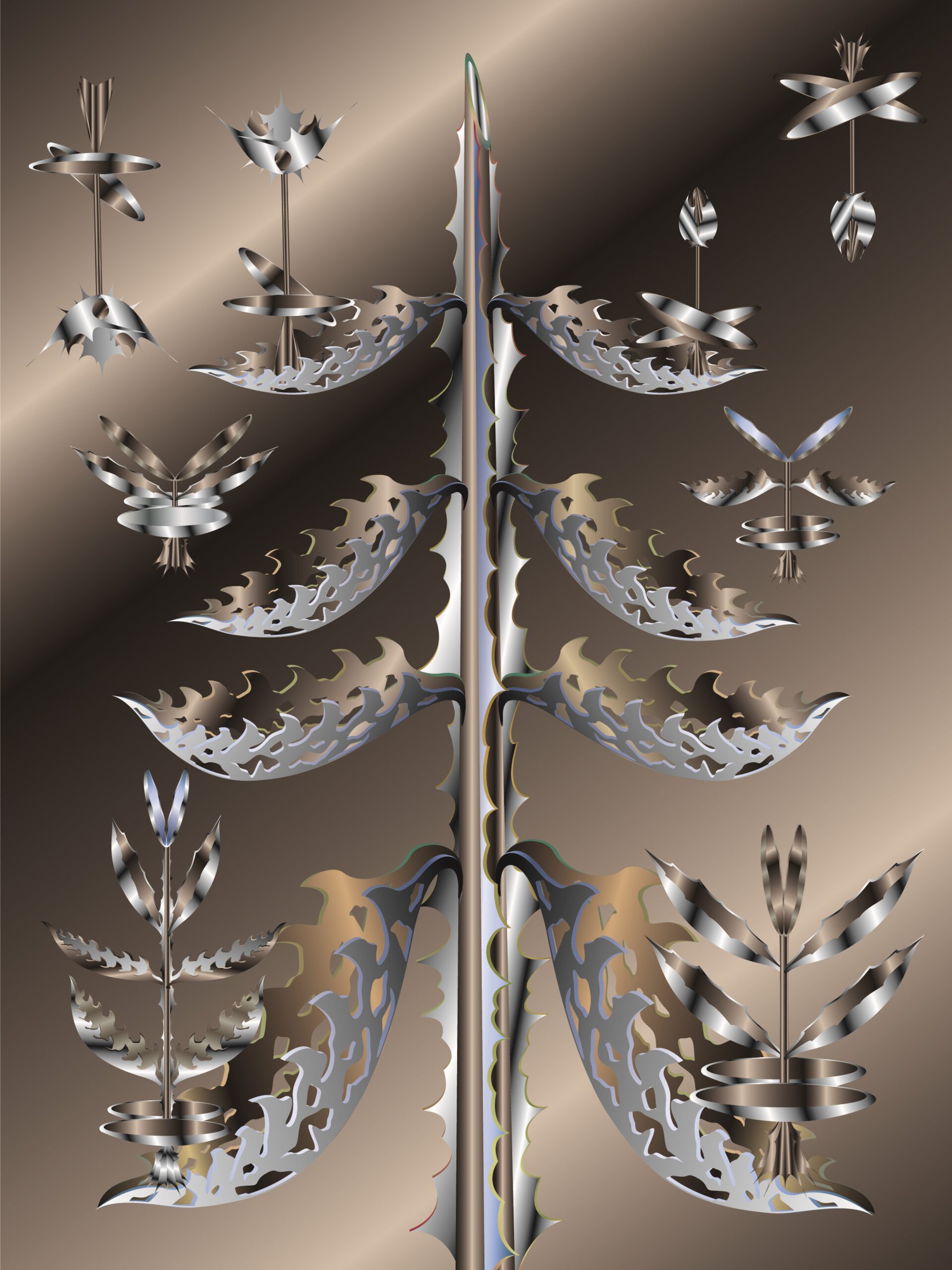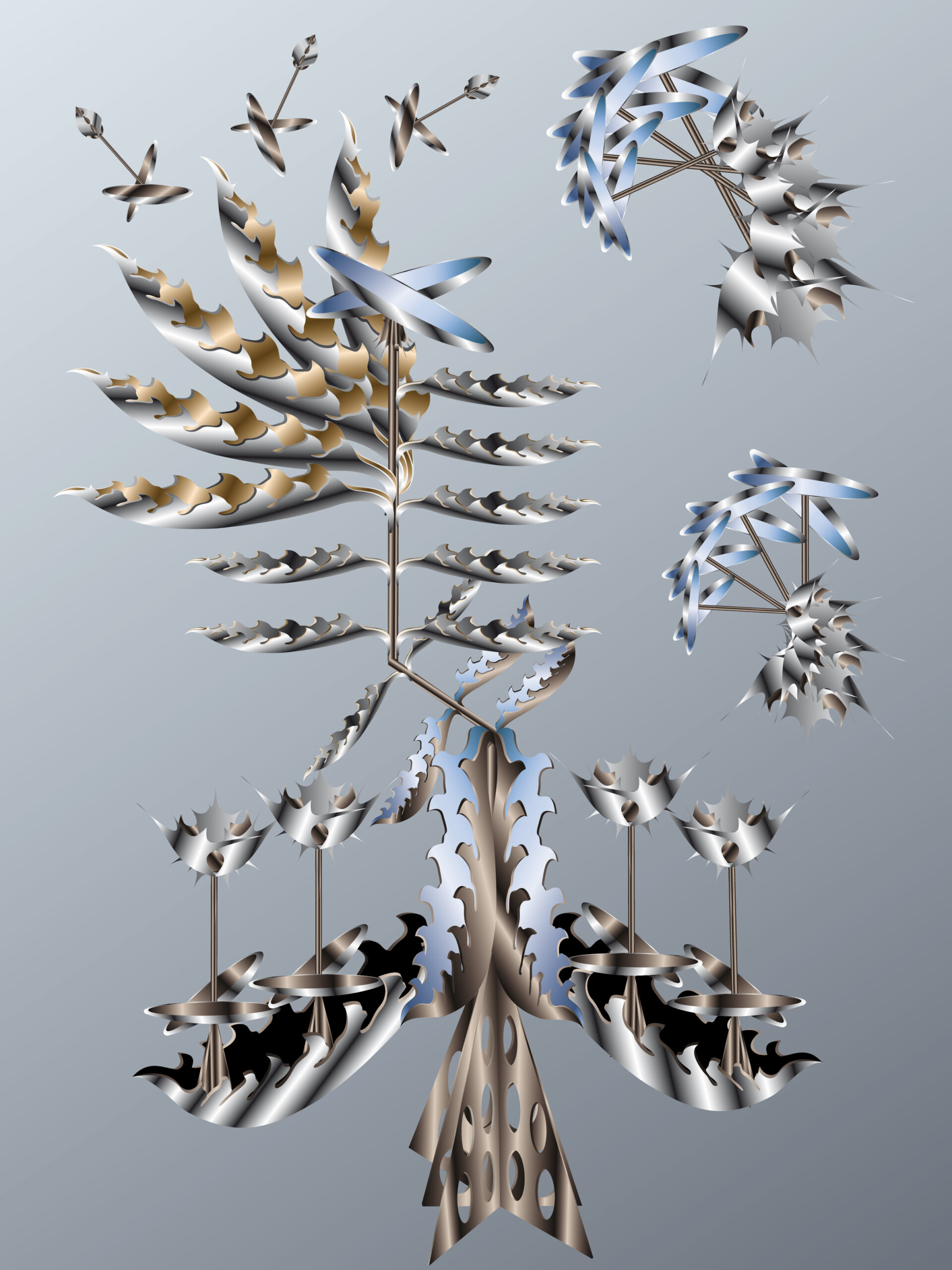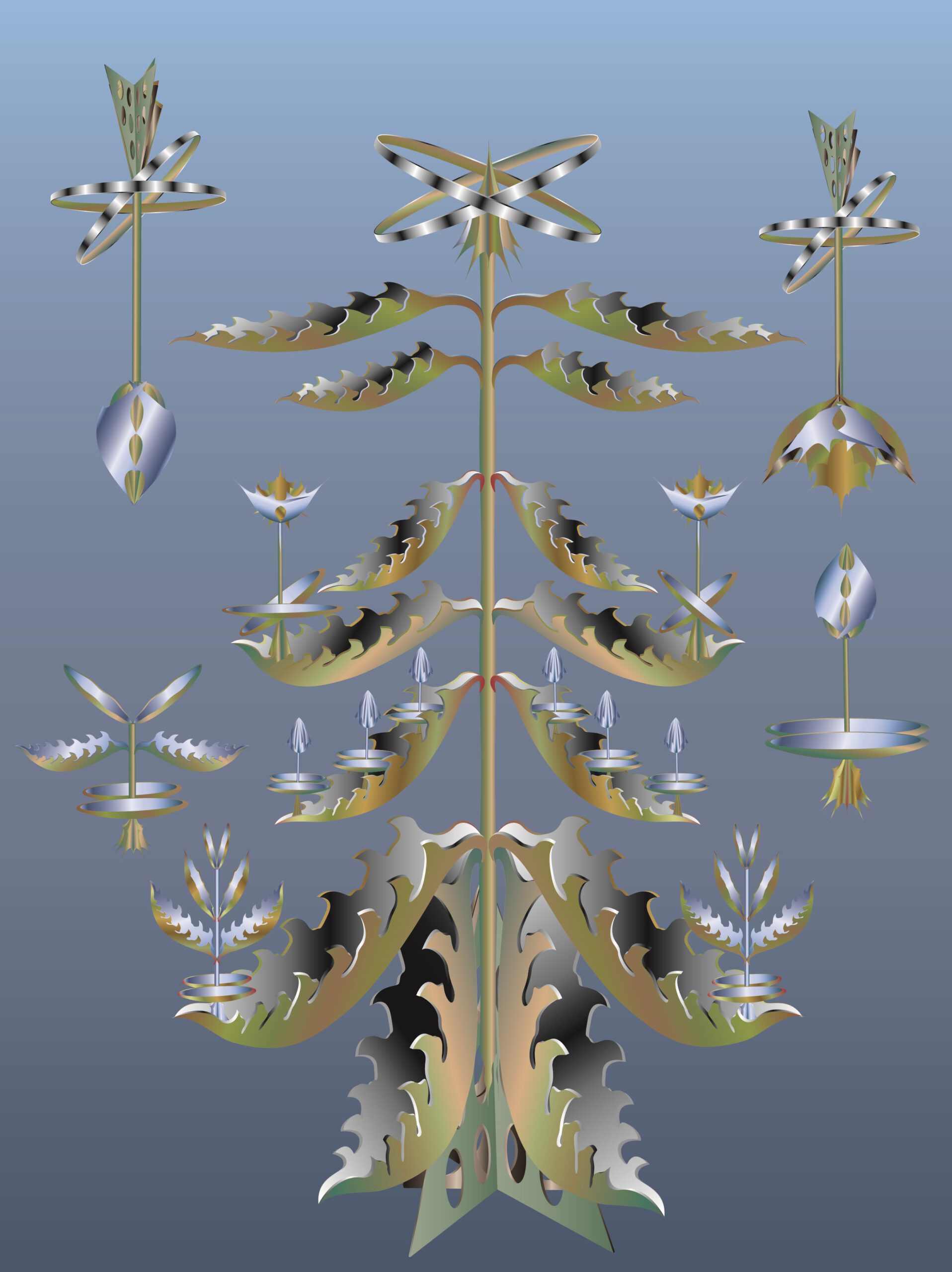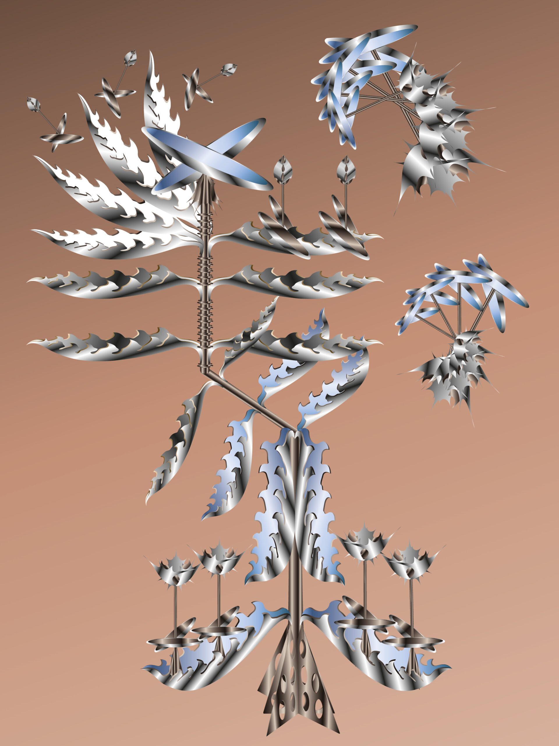 Serie digitale tekeningen van hybride plantmodellen die balanceren tussen natuur en kunstmatigheid,