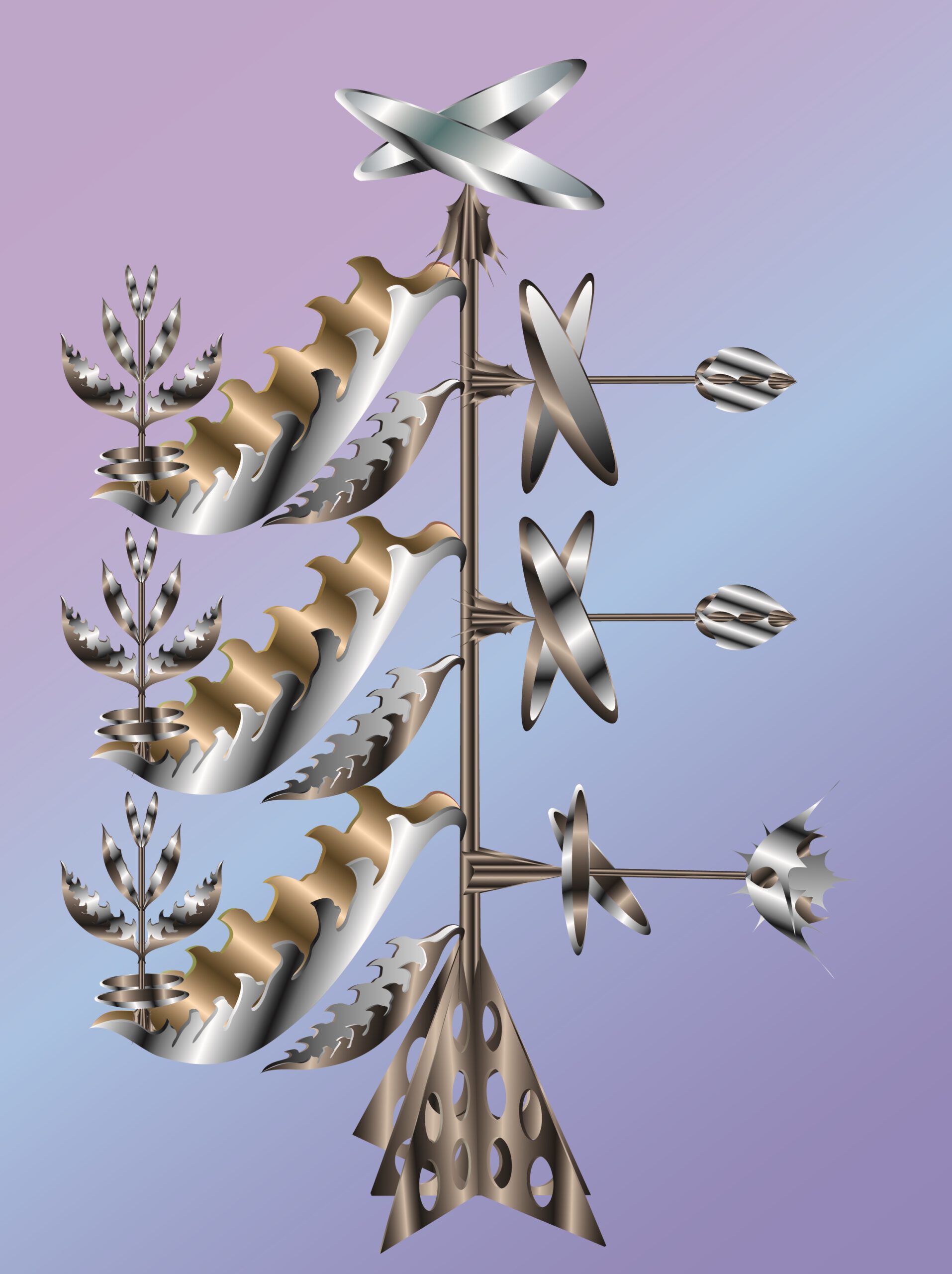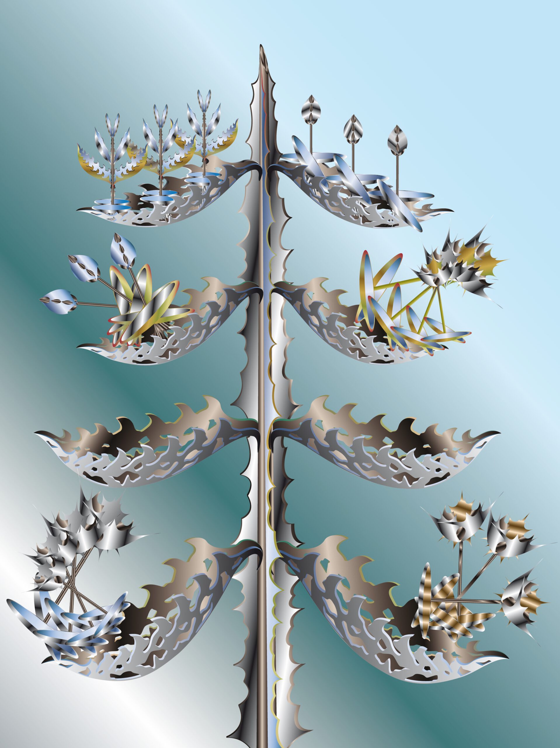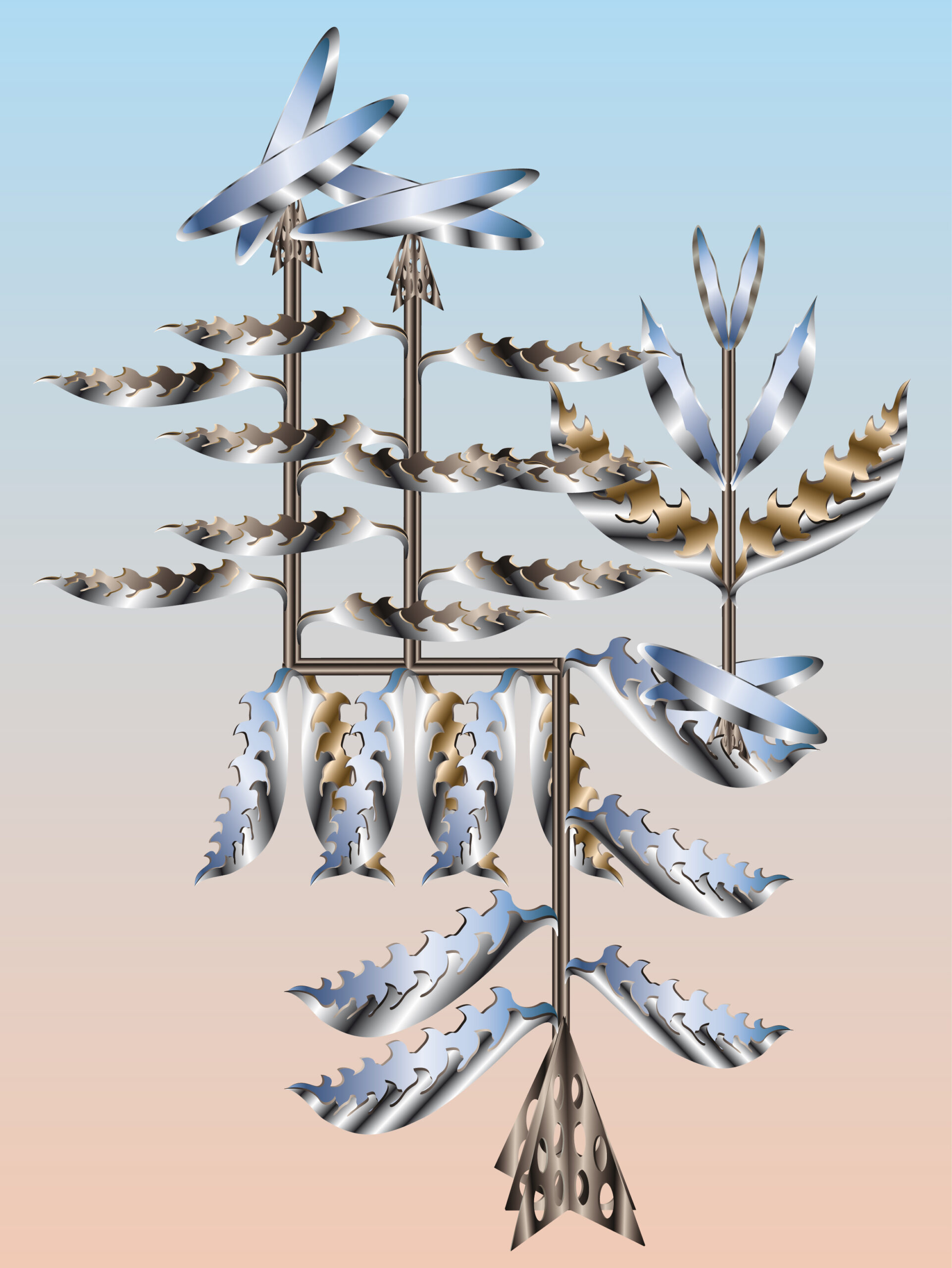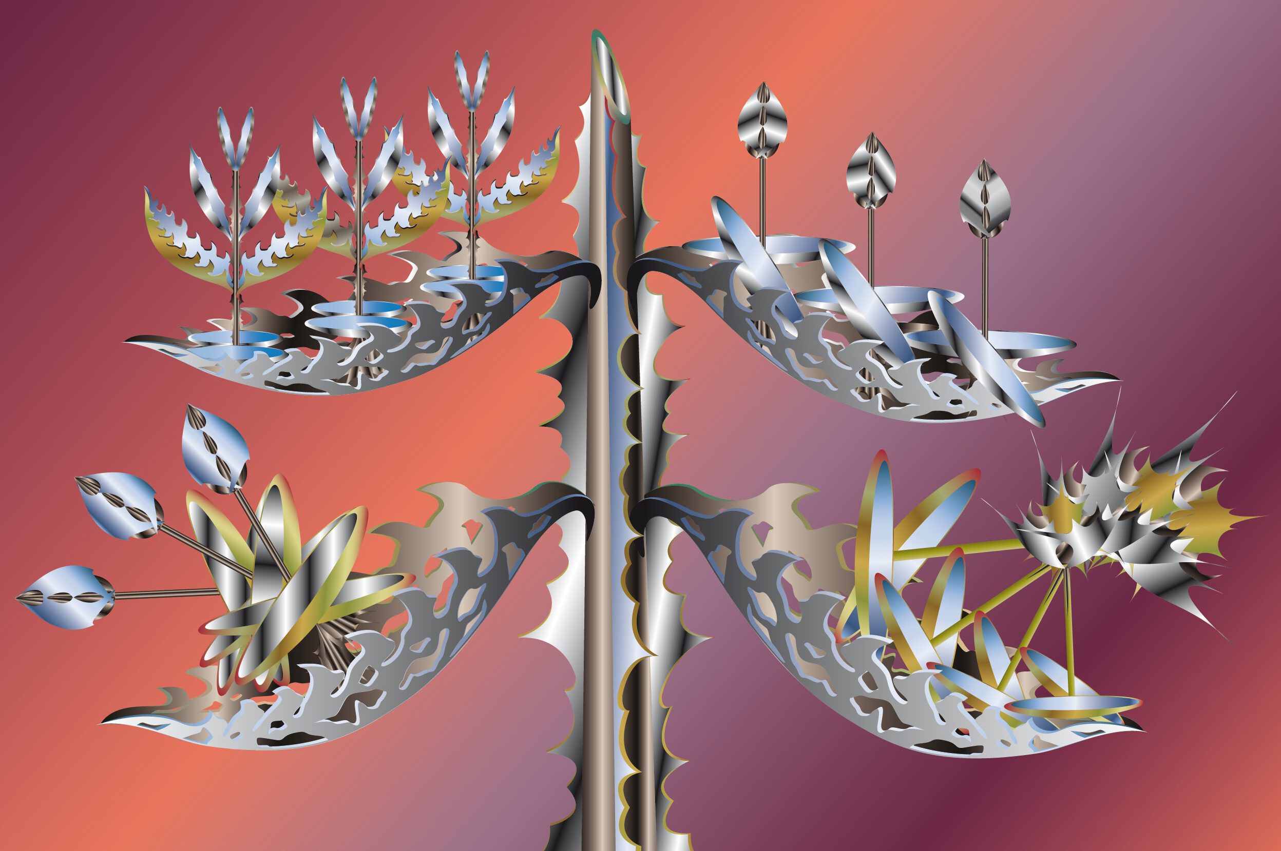 Serie digitale tekeningen van hybride plantmodellen die balanceren tussen natuur en kunstmatigheid,