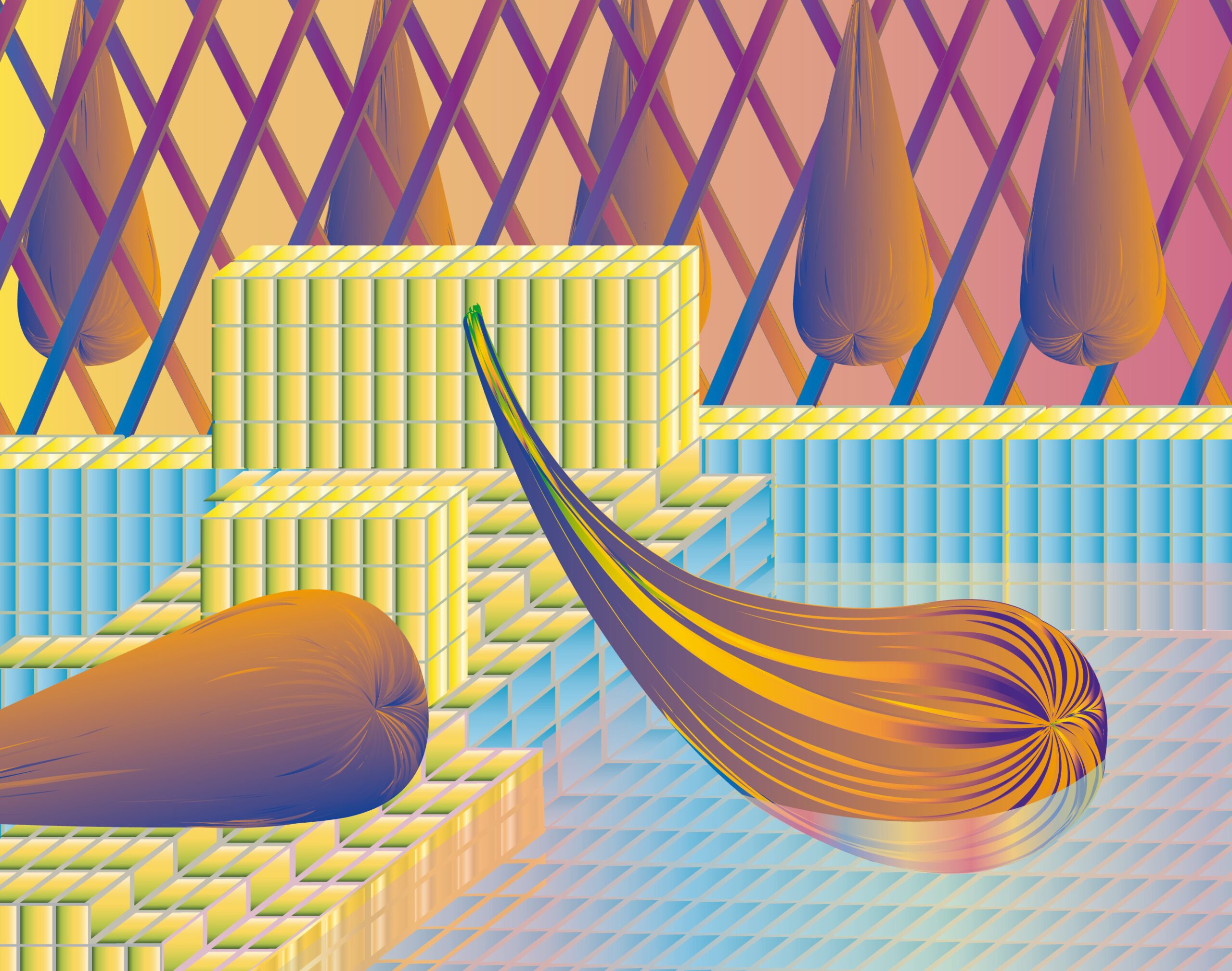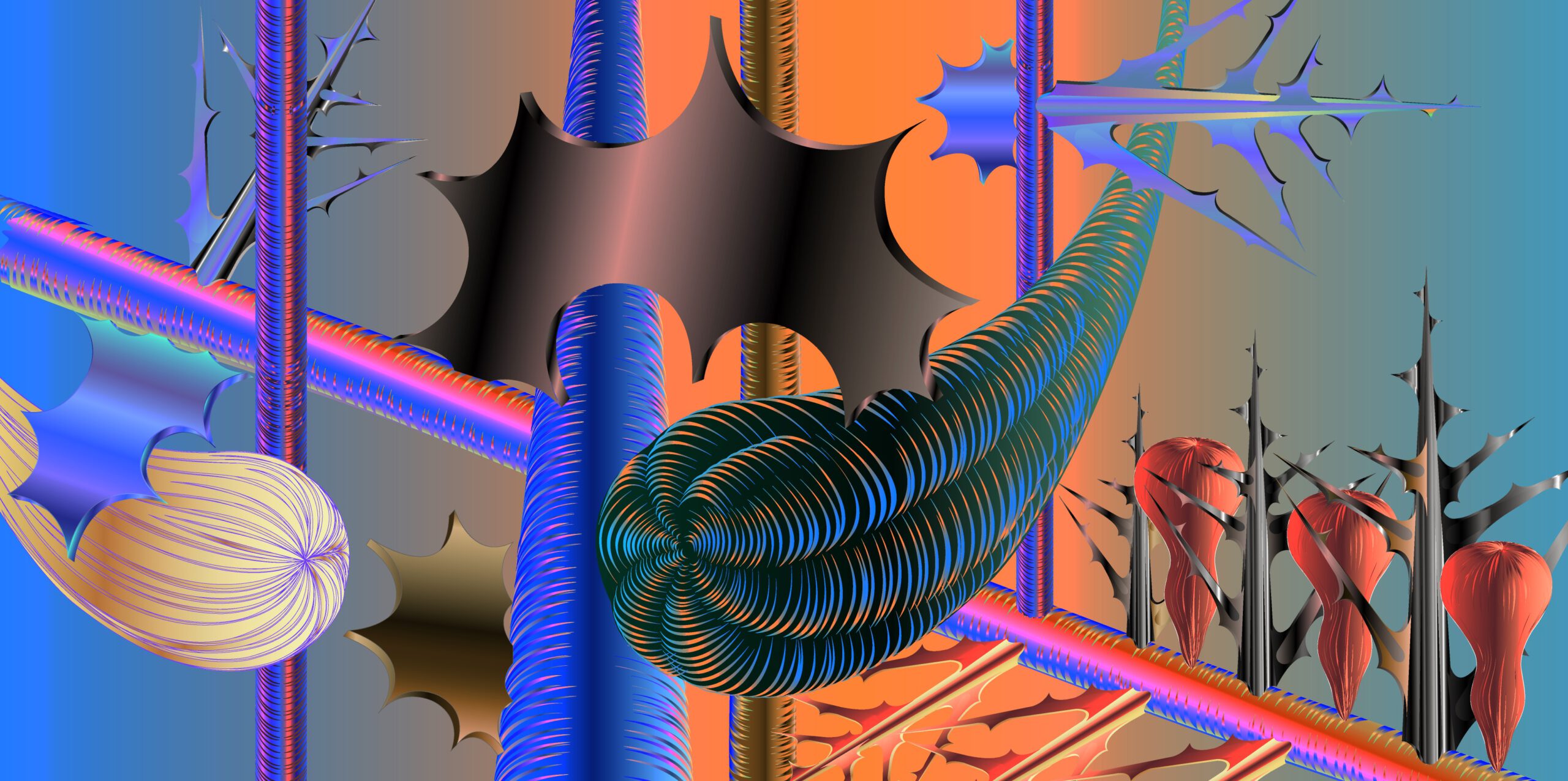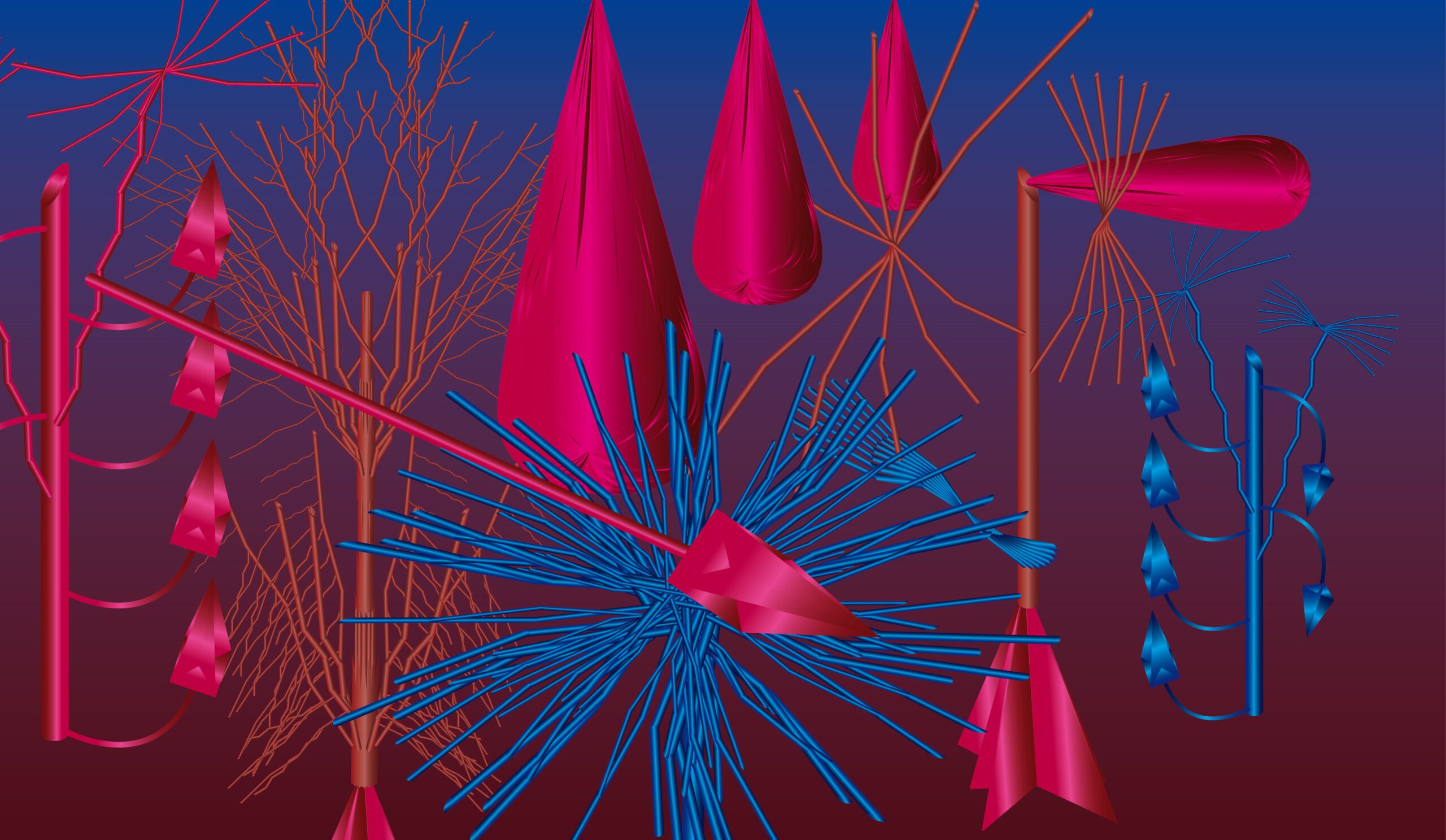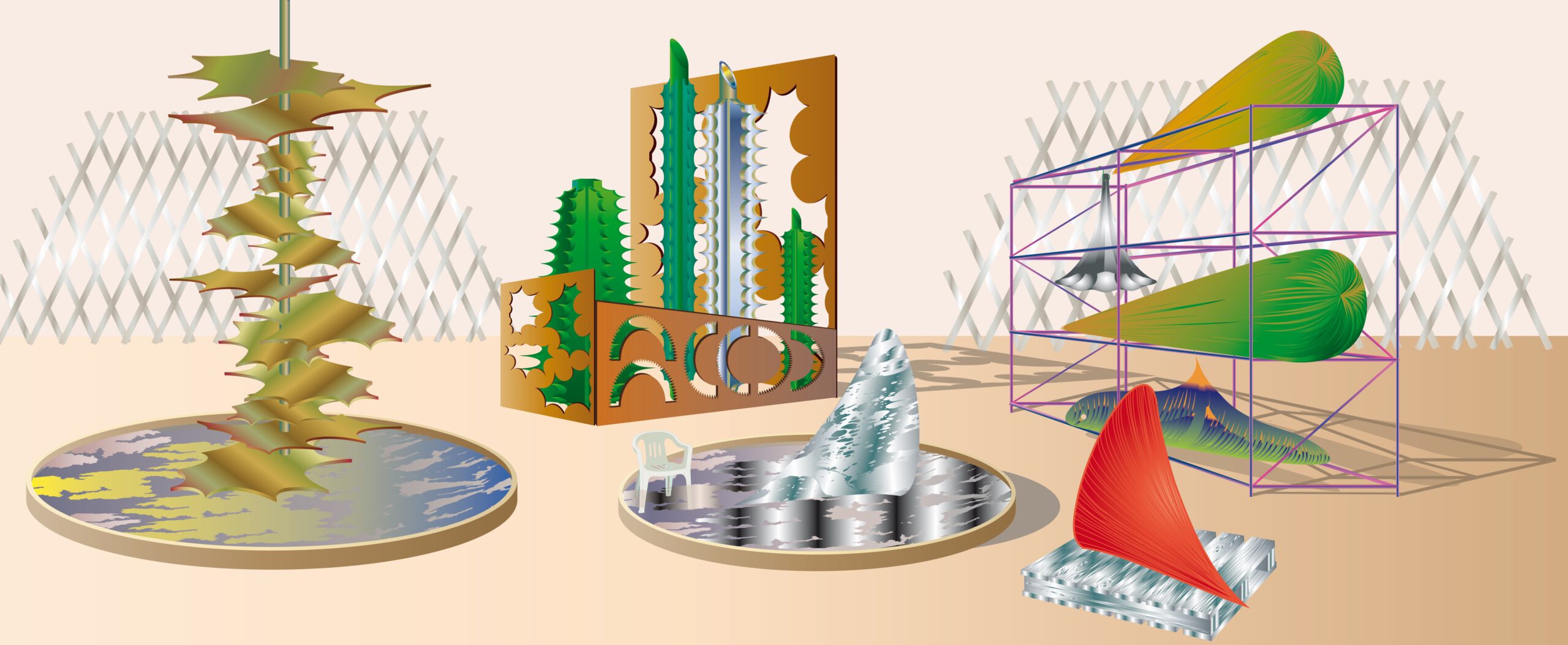 Serie digitale tekeningen van hybride plantmodellen die balanceren tussen natuur en kunstmatigheid,