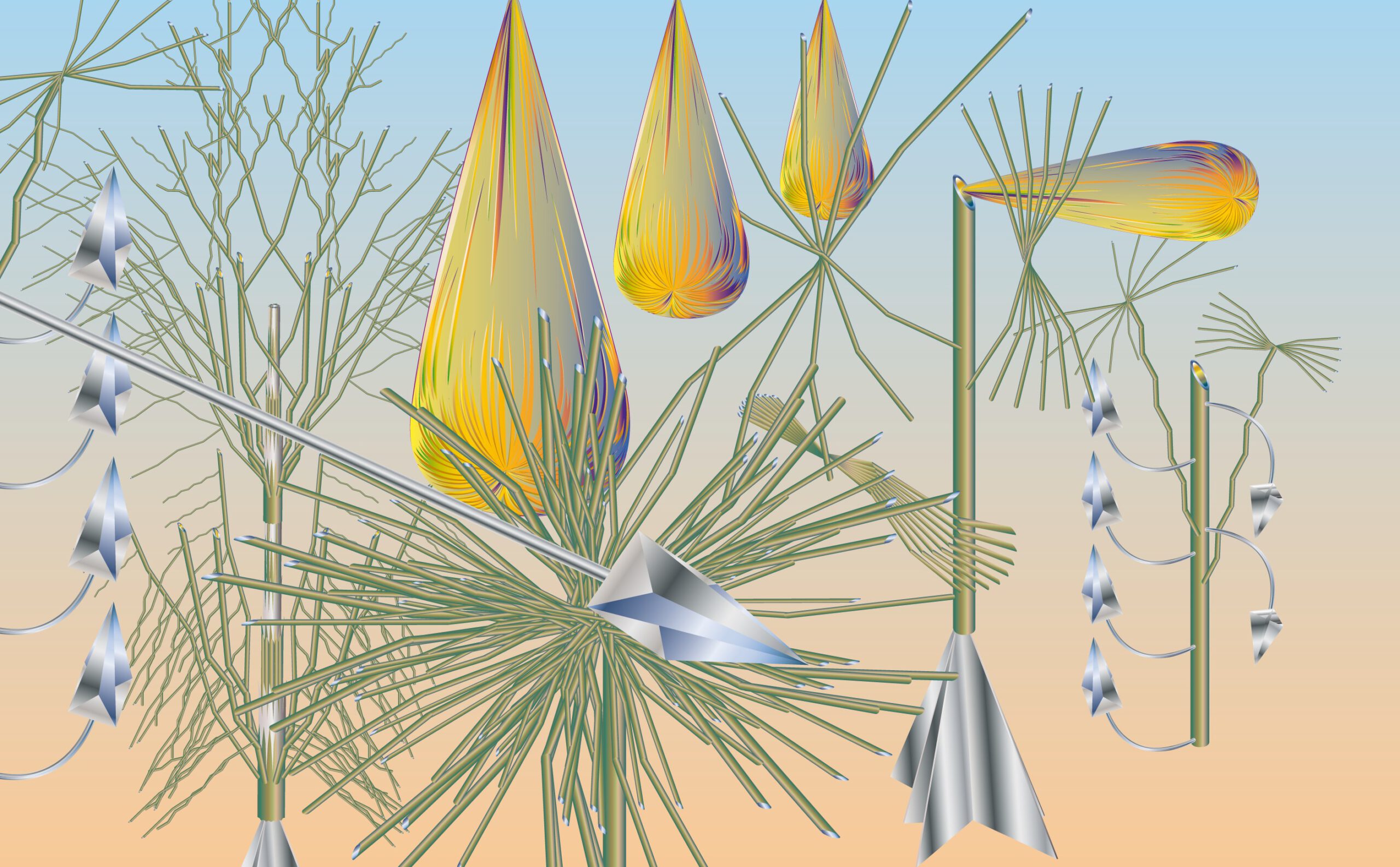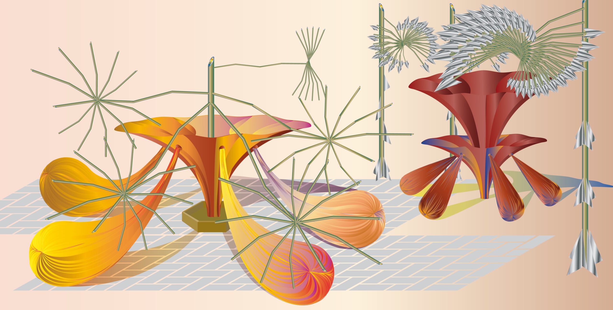De Flowerbombs zijn statische, onbuigzame artificiële plantmodellen, die hun kracht ontlenen aan hun materiaal metaal.