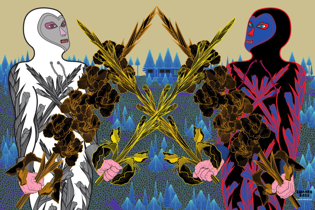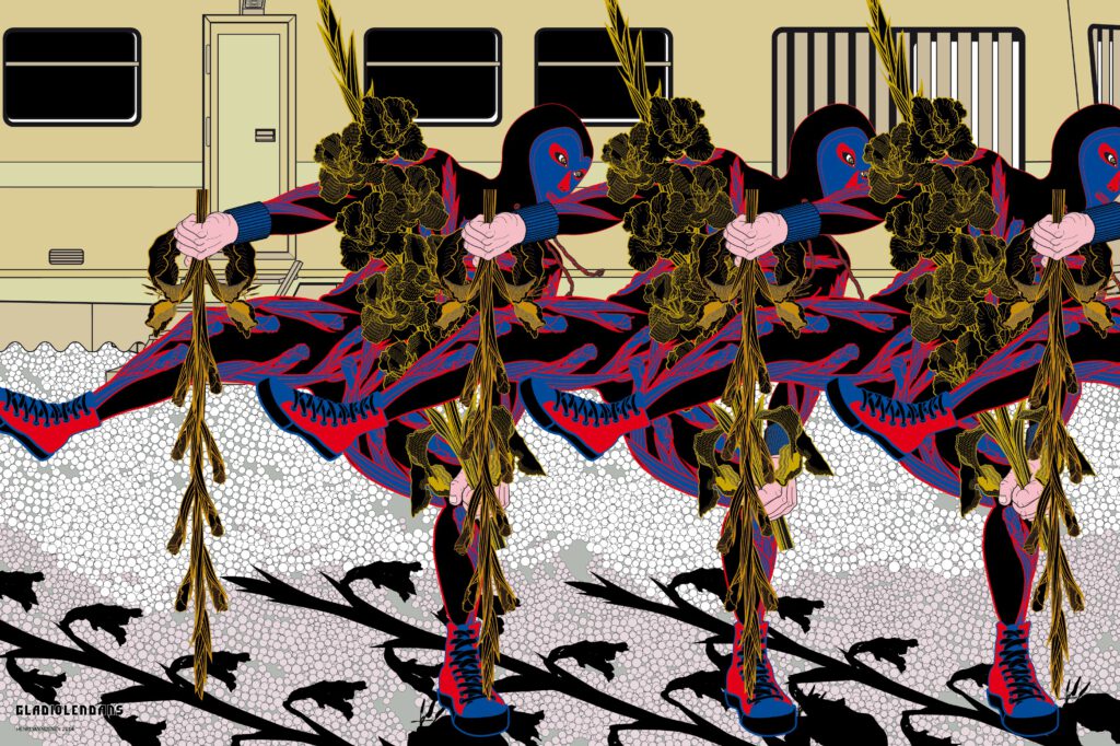 In de serie digitale tekeningen ‘GLADIOOLDANSEN’ staan anonieme manfiguren in speciaal ontworpen excentrieke pakken afgebeeld.