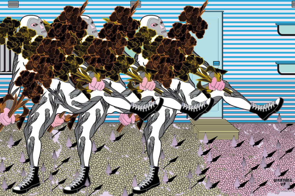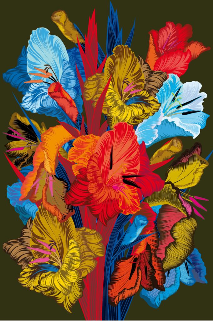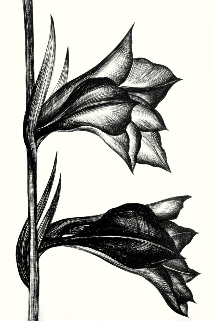 In de tekeningen wereld van Henri van Nuenen worden deze ordinaire, gewone bloemen opgekrikt en opnieuw zichtbaar gemaakt als nieuwe herwaardering voor de Gladiool.