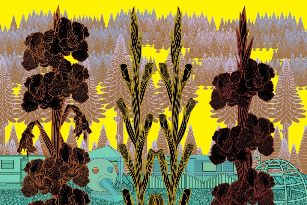 In het caravanpark ZOMERHEIDE groeien metershoge kunstmatig samengestelde gladiolen in onnatuurlijk felle kleuren.