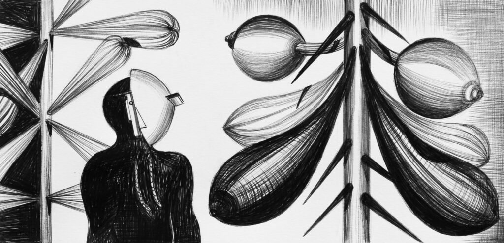 Zijn tekenonderzoek leidt tot verzonnen plantmodellen, geen wetenschappelijke weergaven, maar verbeeldingen van hoe nieuwe plantmodellen zouden kunnen bestaan. Deze planten balanceren tussen natuur en kunstmatigheid en roepen vragen op over overleven, aanpassing en transformatie in een veranderende wereld.